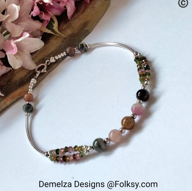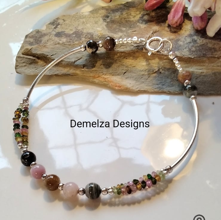 A very attractive unique noodle bracelet designed and hand crafted using a mix of micro faceted watermelon tourmaline rondelle cut genuine gemstones complimented with 5mm round tourmalines. Tourmalines are completely natural in colour and are very expensive in bead form to purchase within the jewellery trade and it has increased in price substantially in recent years. The tourmalines used are very good quality, displaying a range of colour formations provided by mother nature. All outer components are 925 sterling silver. For the main construction flexible professional stainless steel jewellers wire has been used for added strength and lasting durability, finished off with a 925 sterling silver bolt ring clasp.