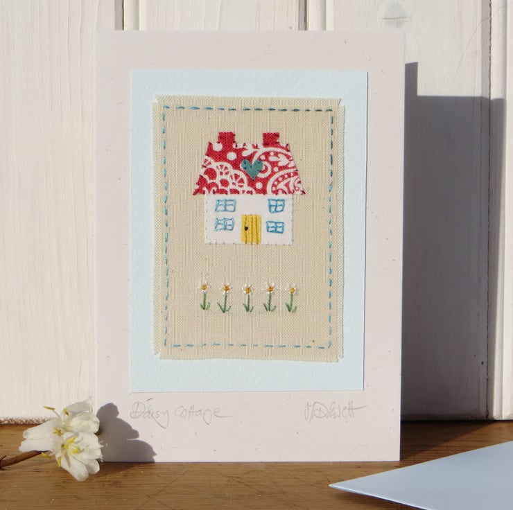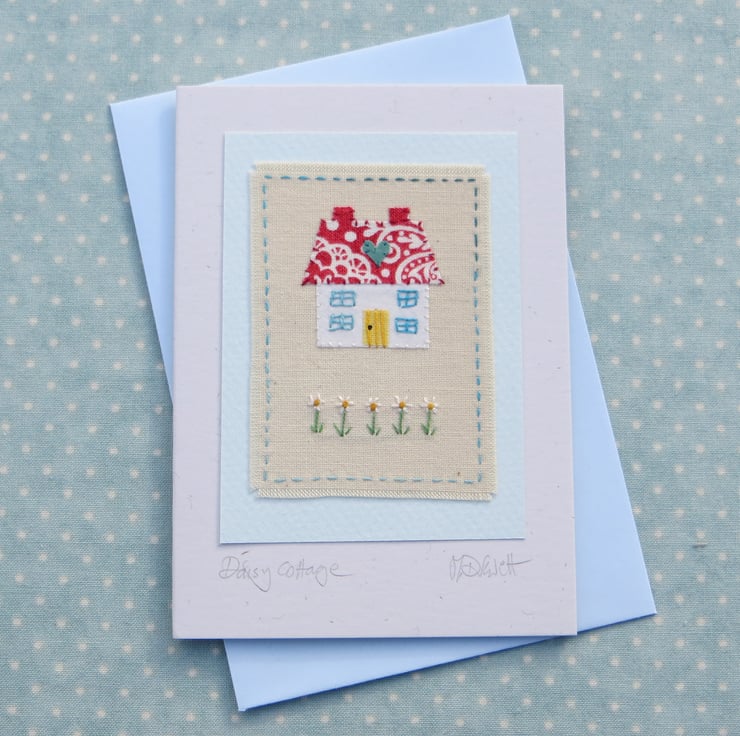 A unique hand-stitched miniature applique cottage with embroidered details, including a row of daisies and tiny heart on the roof. My cards measure 12 x 9 cm (3.5” x 5”) and come with recycled paper envelopes in a protective cellophane sleeve. Each card is signed on the front and my studio stamp is on the back. The title is also written: 'Daisy Cottage'.