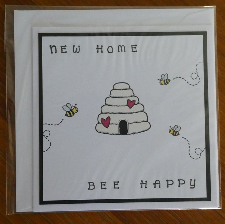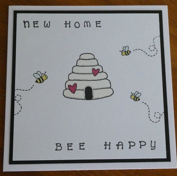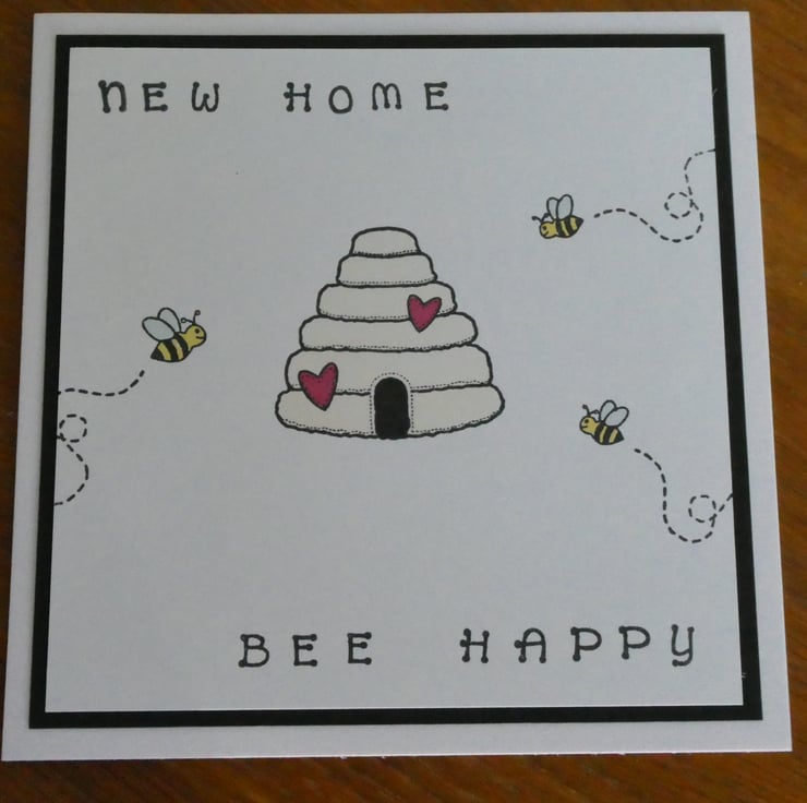 This sweet New Home card has been hand stamped with a design of bees and a bee hive decorated with hearts. It has been coloured in cream, red and yellow and finished with the greeting 'New Home Bee Happy'.
