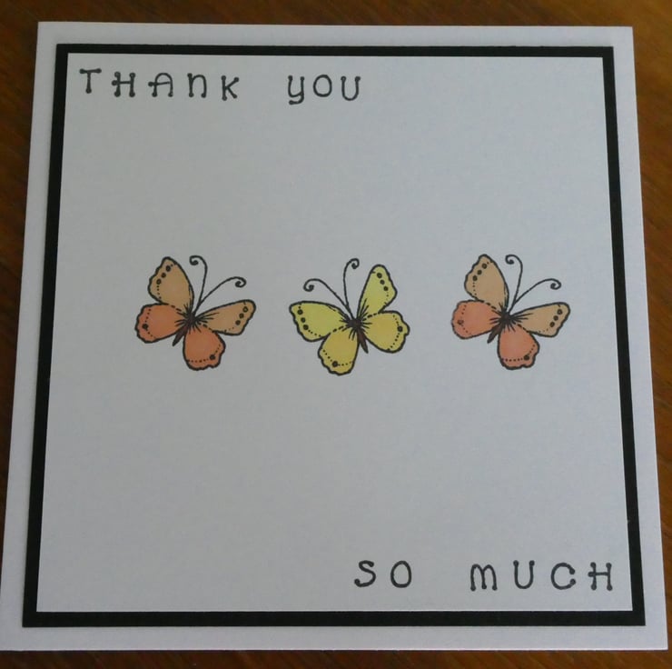 This sweet Thank You card has been hand stamped with 3 butterflies and the message 'Thank You So Much'.