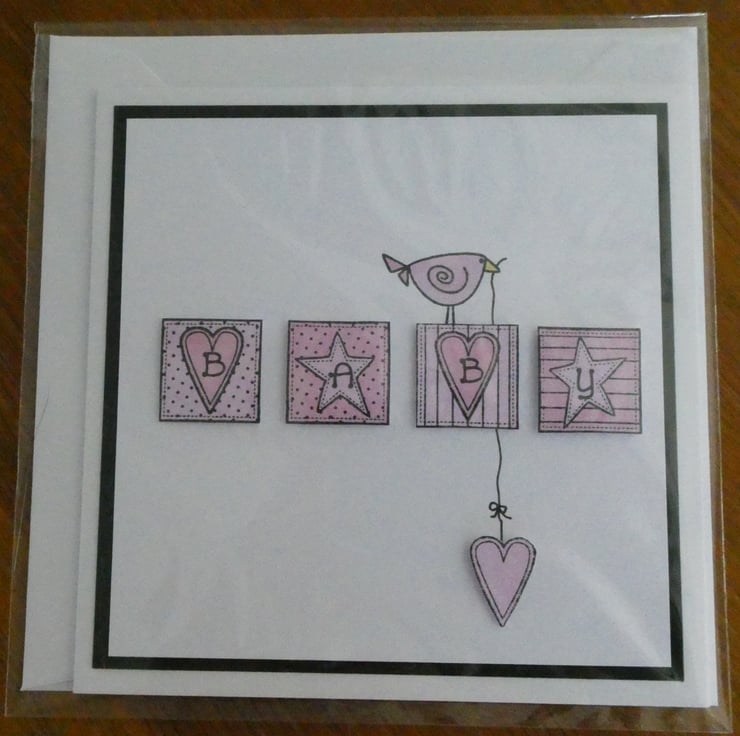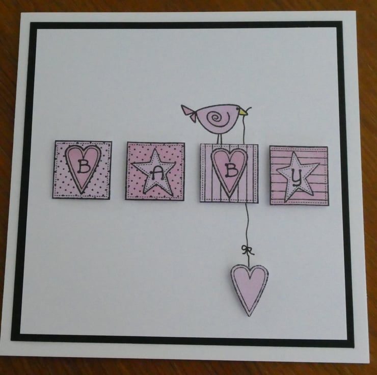 This sweet New Baby card features four square blocks hand coloured in shades of pink and stamped with the letters BABY and a cute pink bird holding a dangling pink heart.