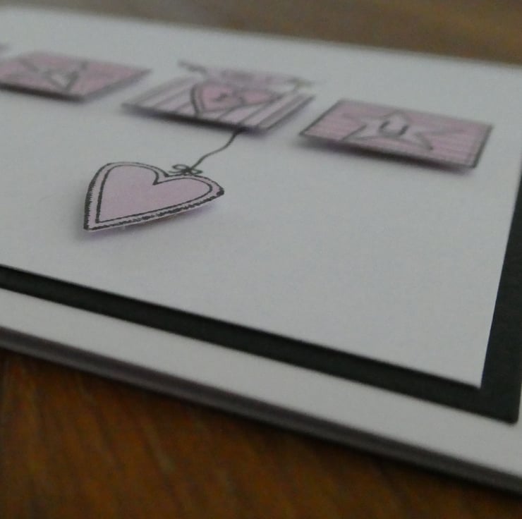 The blocks and heart are raised from the front of the card to give dimension and the design is mounted on a black card frame for a finishing touch.