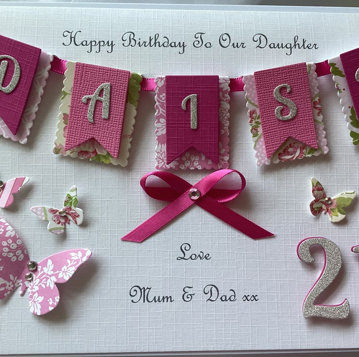 This card can be personalised with a name of up to seven letters and a greeting above and below the bunting along with any age.