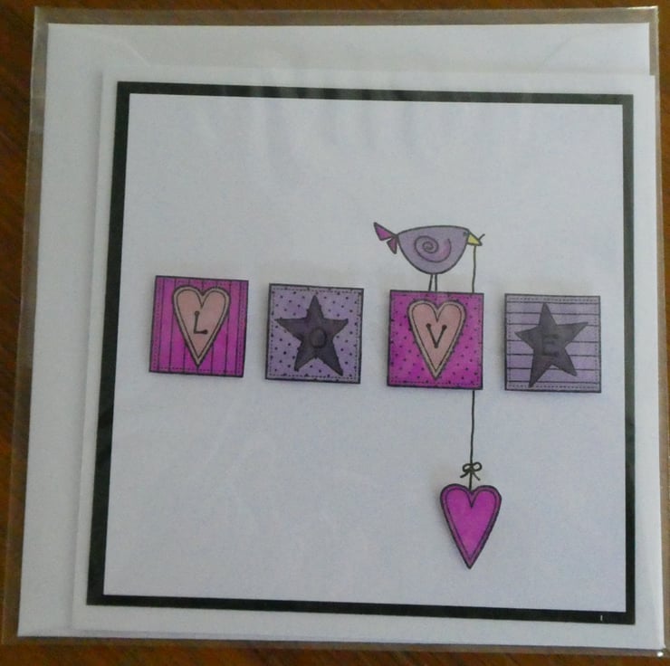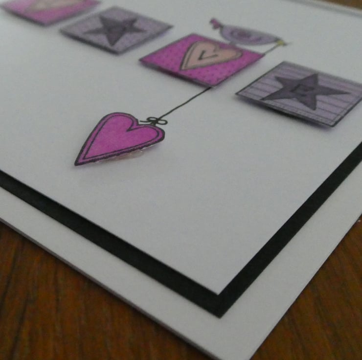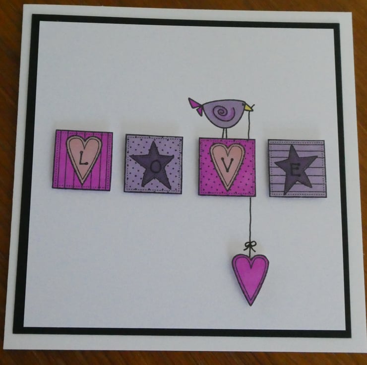 This cute card features four square blocks hand coloured in shades of pink and purple and stamped with the letters LOVE and a cute purple bird holding a dangling pink heart.