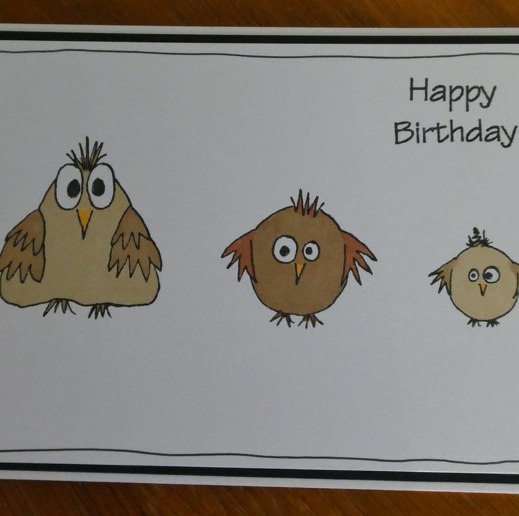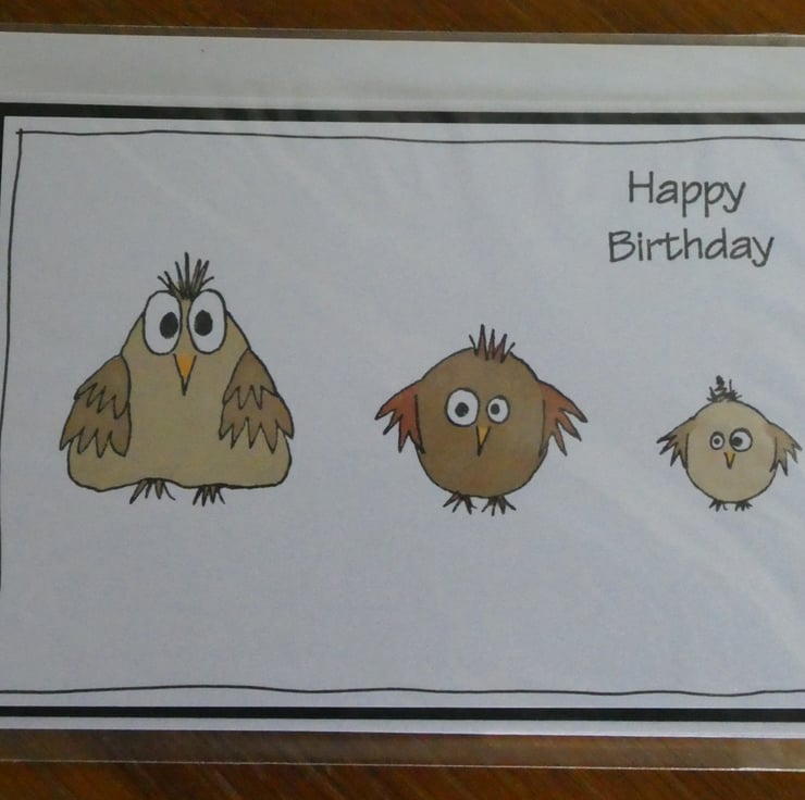 This quirky card features 3 hand stamped and coloured birds who look rather surprised to find themselves on a card! The design is framed with a hand drawn deliberately wobbly line to add to the effect.
