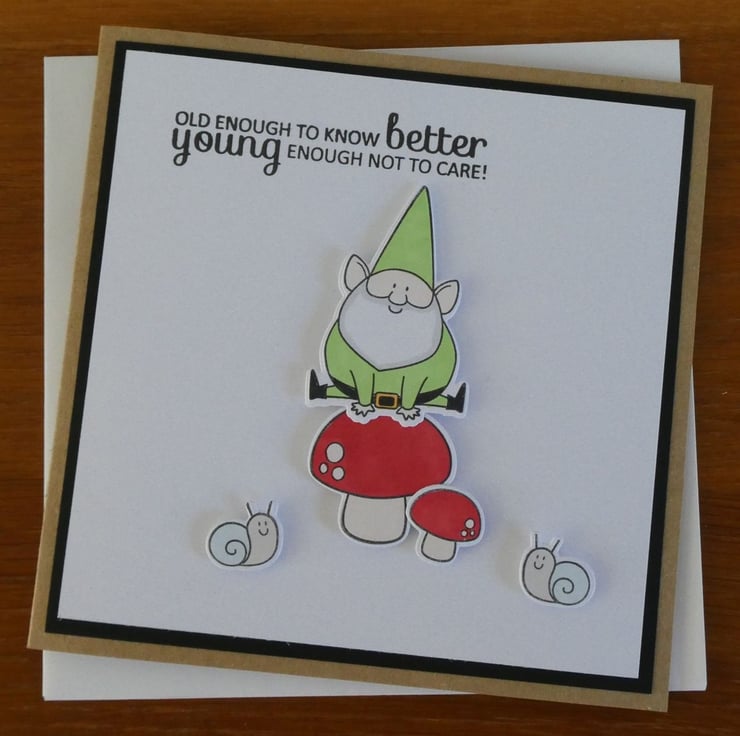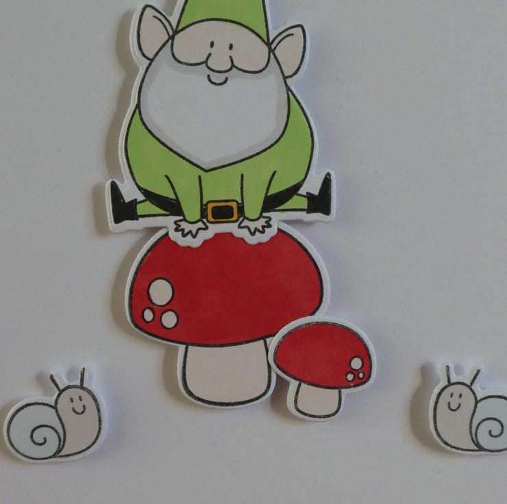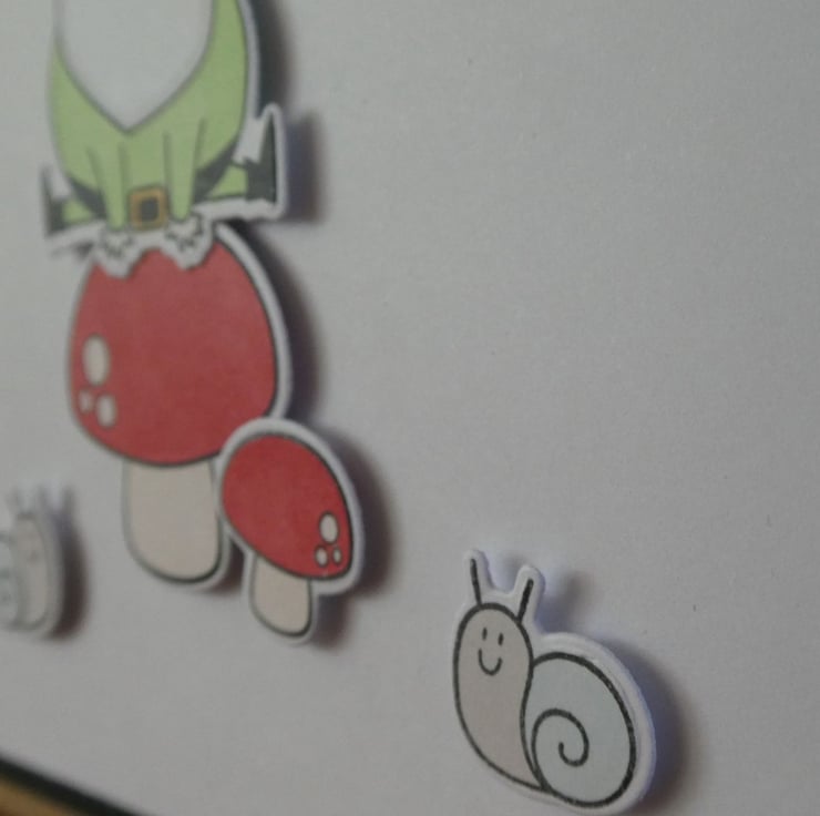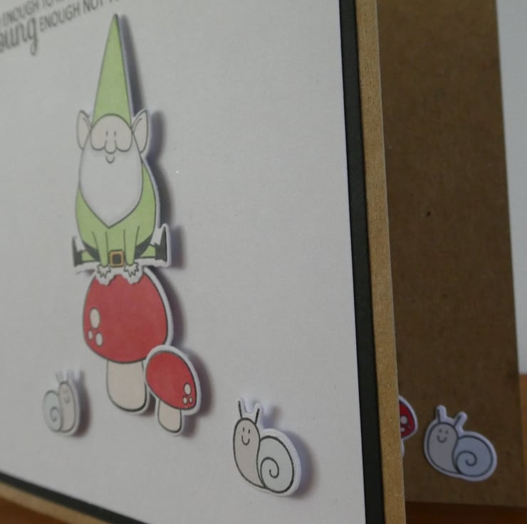 This Birthday card shows a gnome leap frogging over a toadstool watched by two cute snails. The images have been hand stamped and coloured and have been raised on foam pads to create dimension.