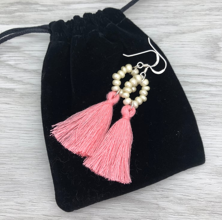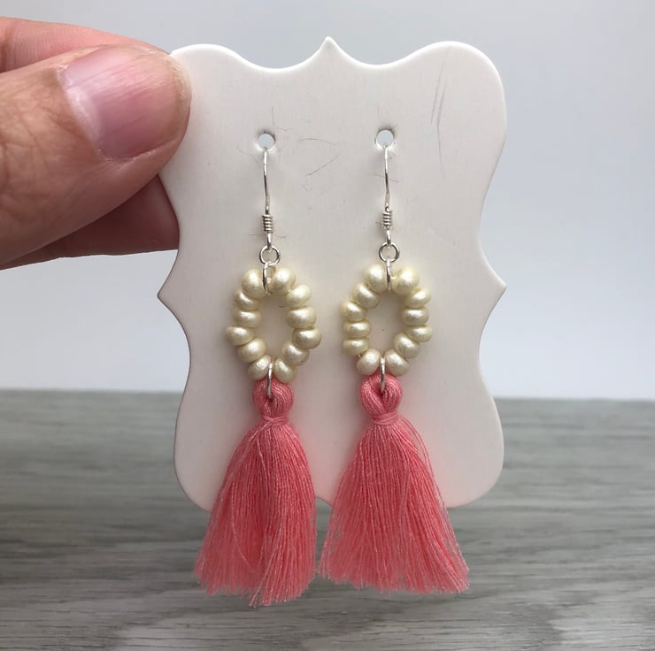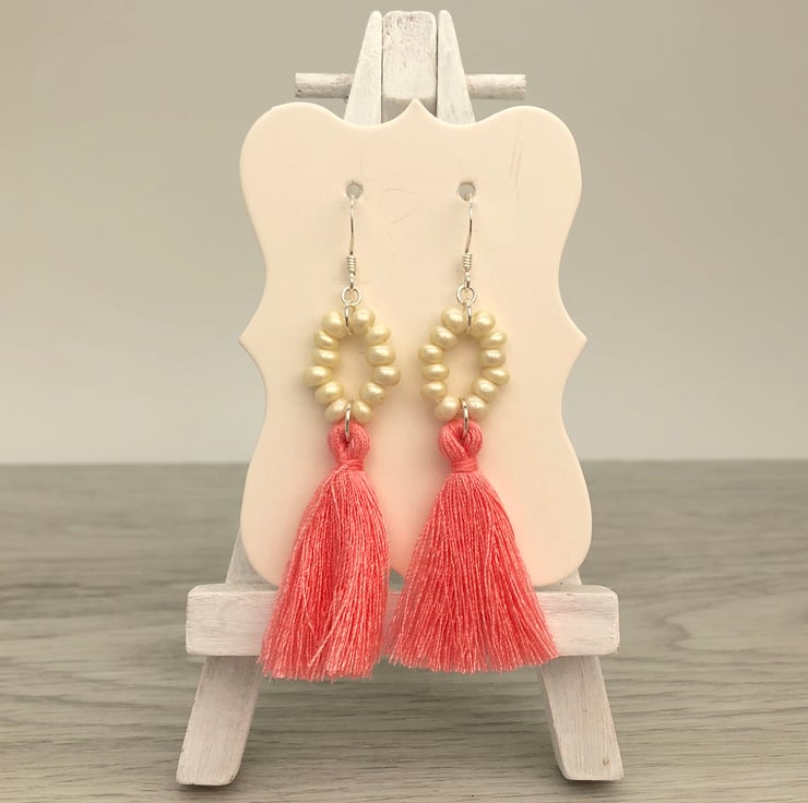Pearl effect seed beads have been sewn using fire line thread and hang above pretty pink tassels using sterling silver jump rings.
