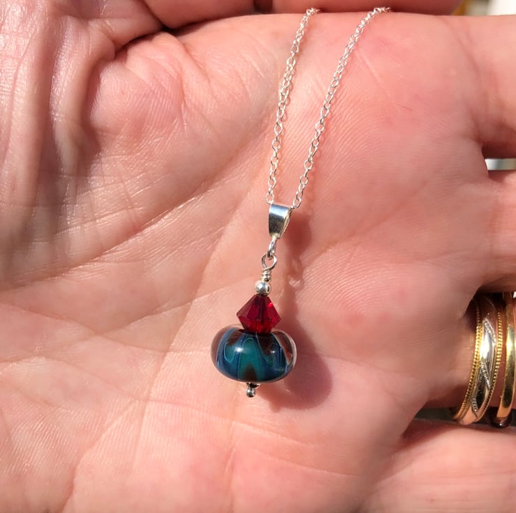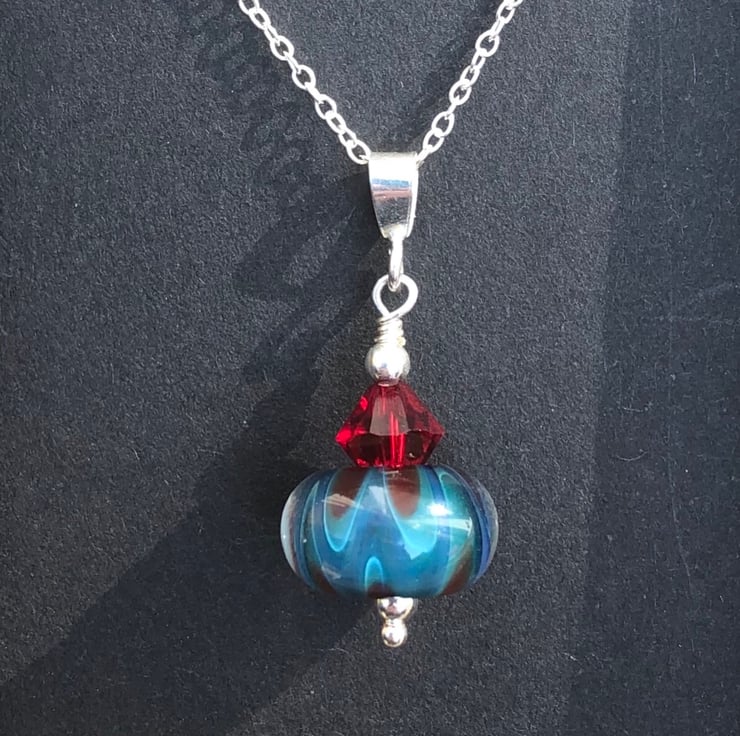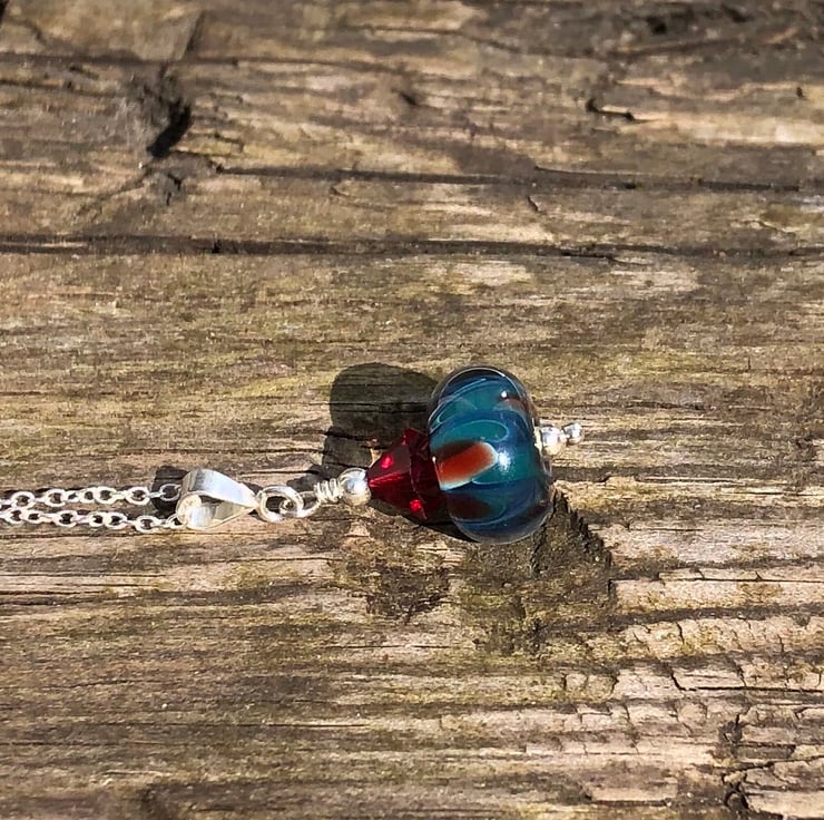 This turquoise and red lampwork glass bead has been teamed with a 6mm red Swarovski Crystal.