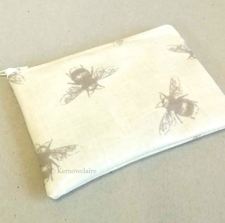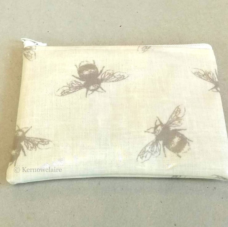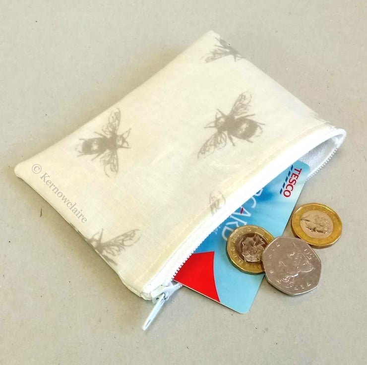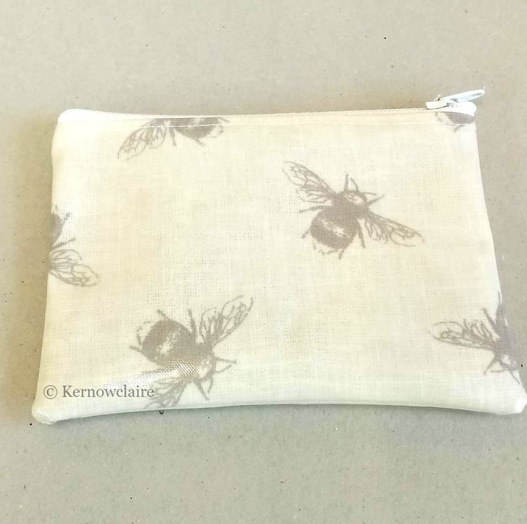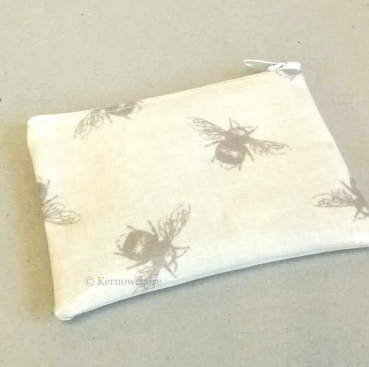 This is a lovely coin purse, handmade in a beige oilcloth with grey bees pattern. It has a white zip closure and the inner seams are double stitched for added strength. Perfect for coins or cards