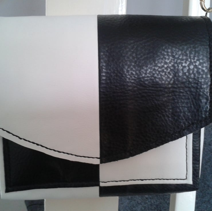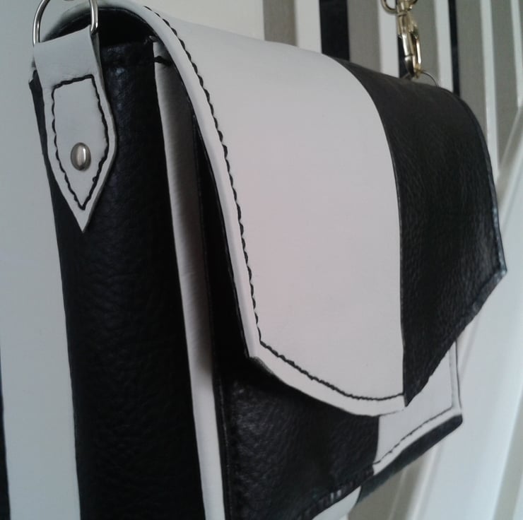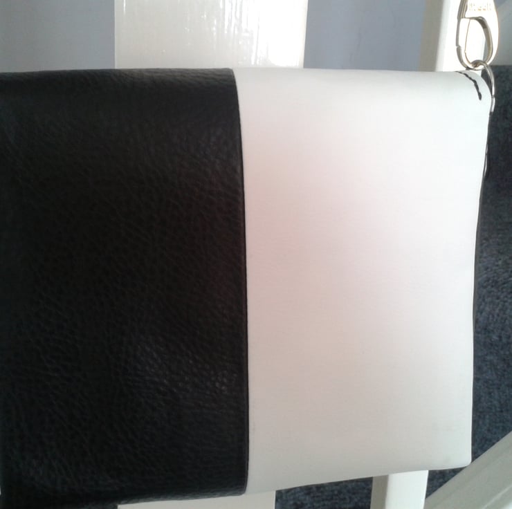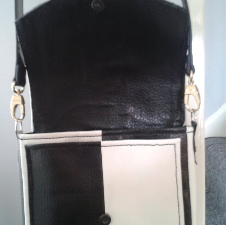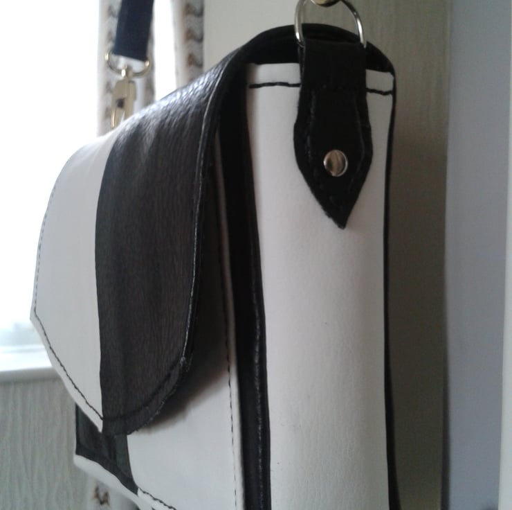 made from recycled leather (black) and eco leather (white) nice two tone design with black leather lining, magnetic catch, pocket on front, adjustable leather strap. size 8 x 6.5 x 2 inches approximately