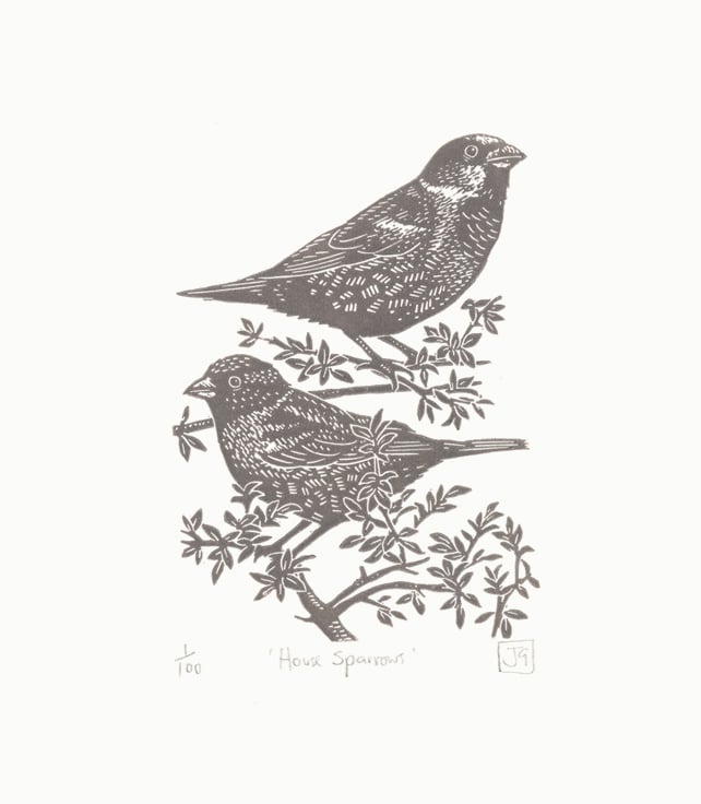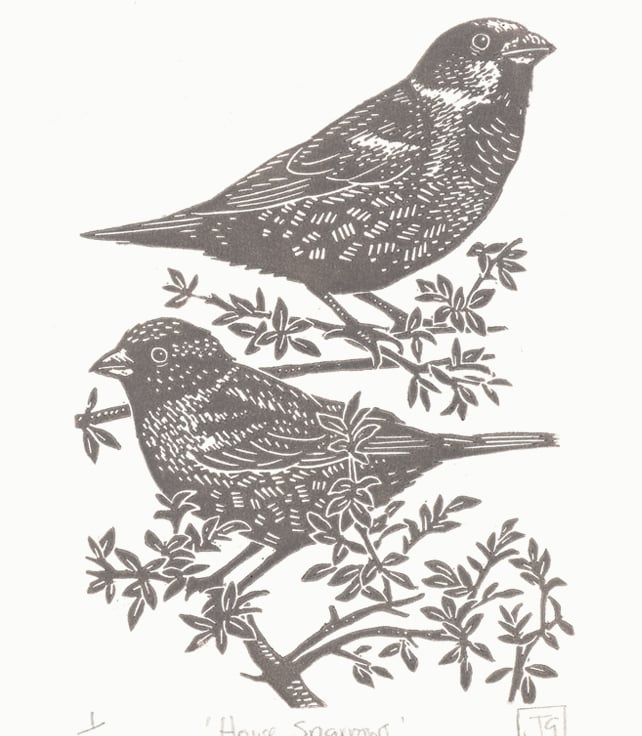 A one-colour hand-printed linocut entitled 'House Sparrows'.