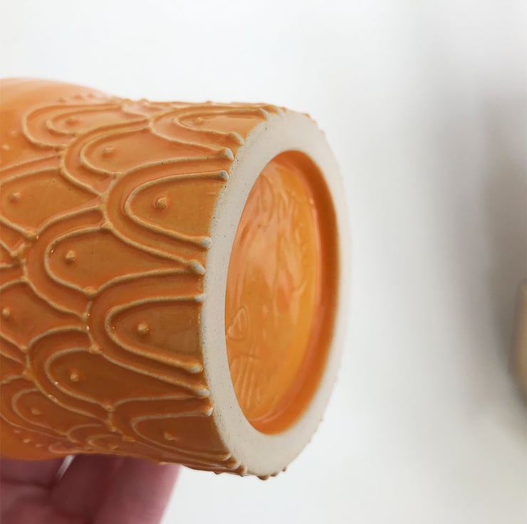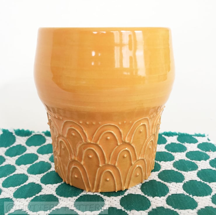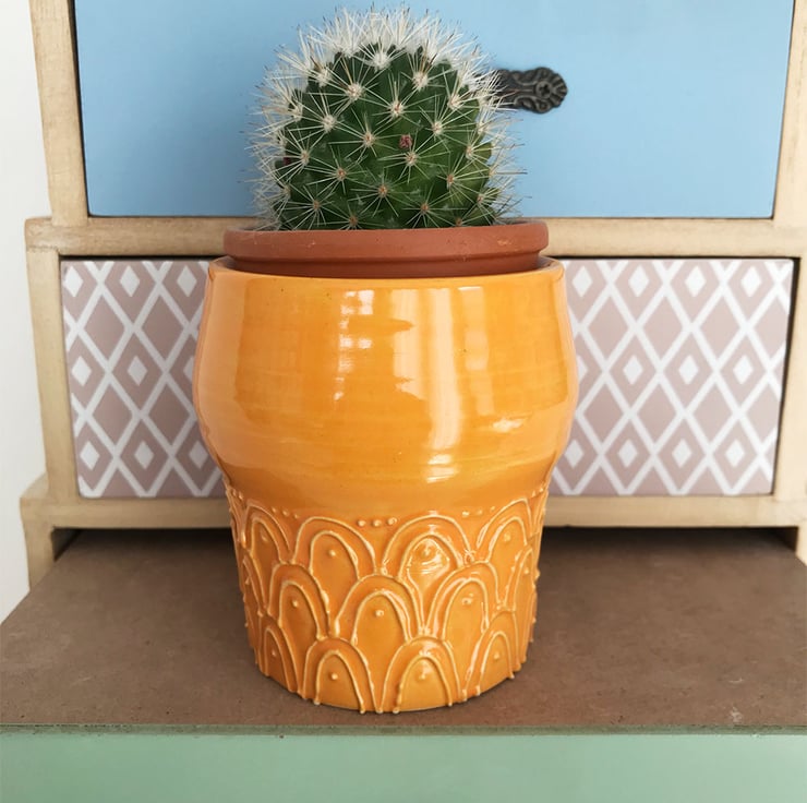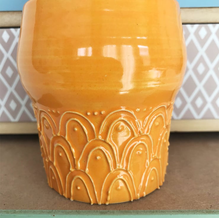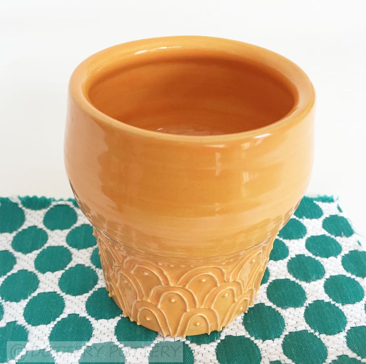 This hand thrown pottery beaker is made from white earthenware clay. It has been thrown on the pottery wheel and decorated using various techniques in a retro style. It has been finished in a food safe, shiny orange glaze. This beaker is nice and petite to hold, perfect for a lovely cup of tea or useful as a plant pot/ trinket pot! and measures 8cm high x 8.8cm wide.