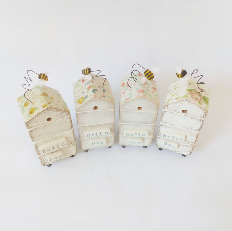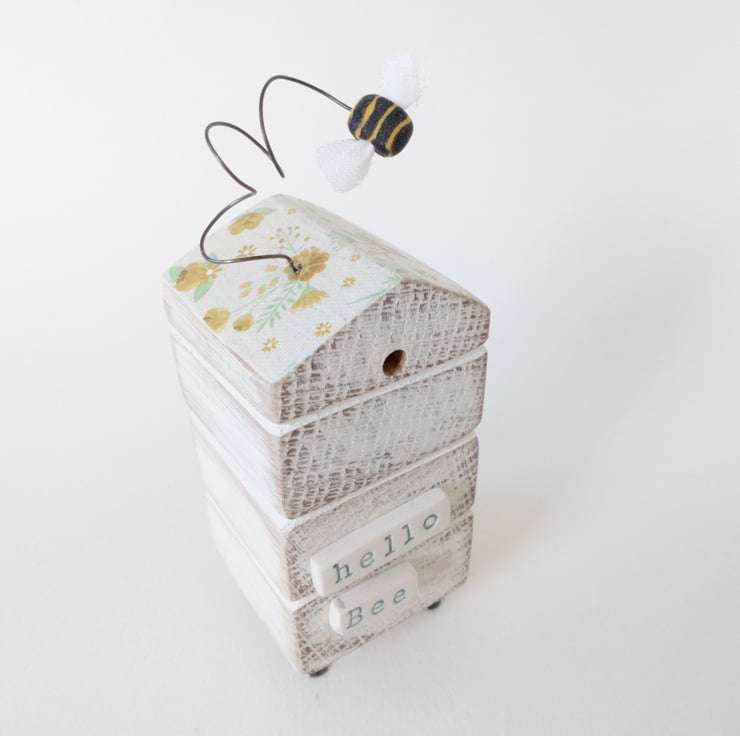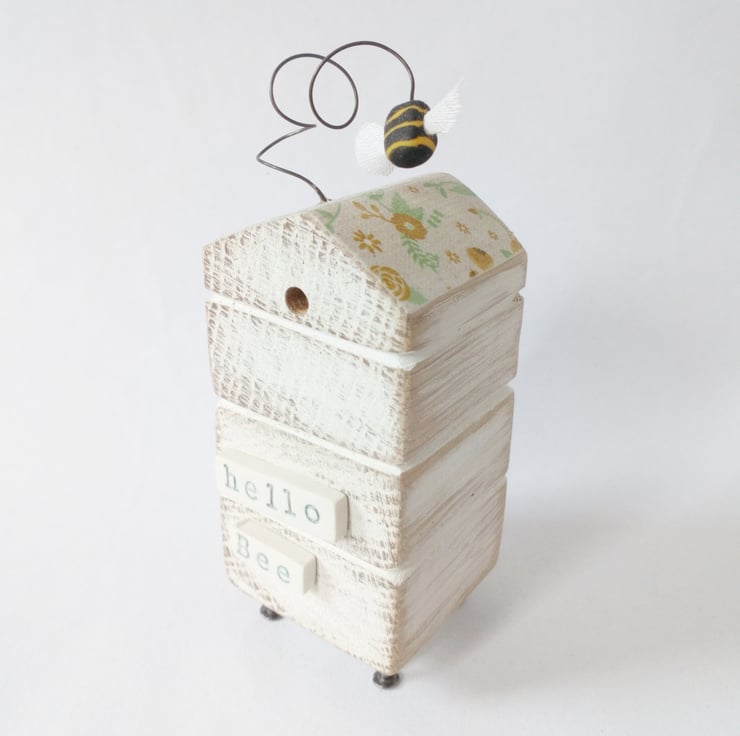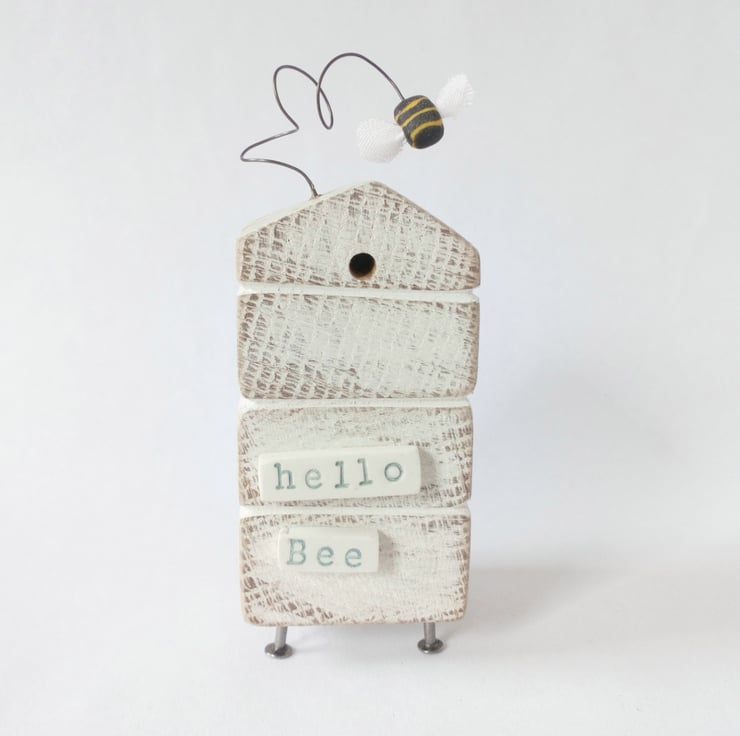 Painted white and sanded smooth the roof of the hive is adorned with flowers and the little bee dances on a bendy wire. The sign on the front reads 'Hello Bee' and is made from polymer clay which is shaped, fired and painted as is the bee with the tiniest fabric wings to finish.