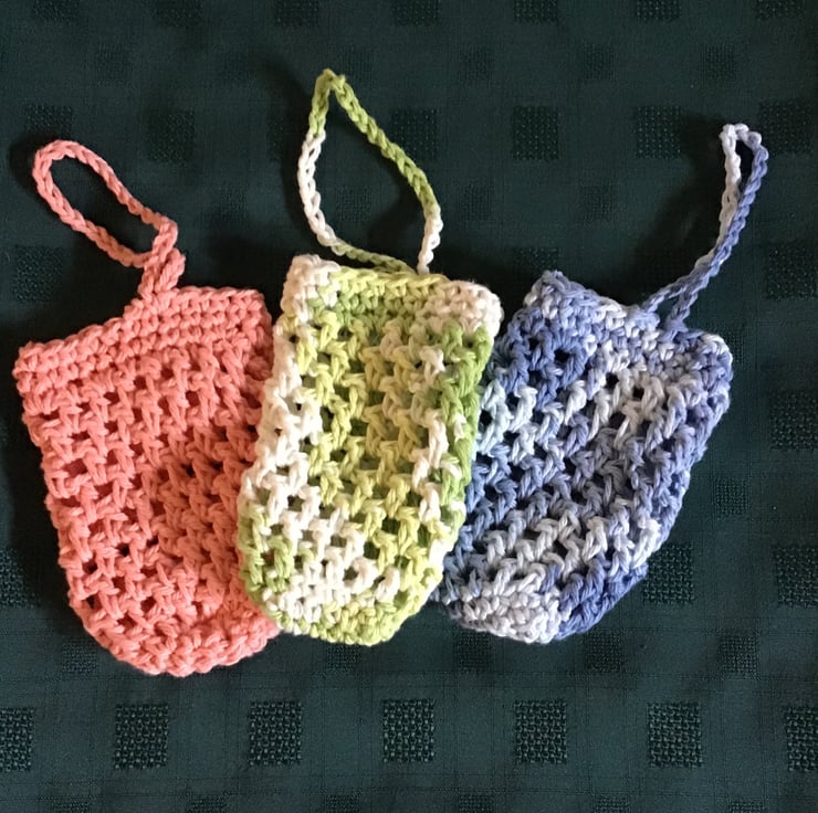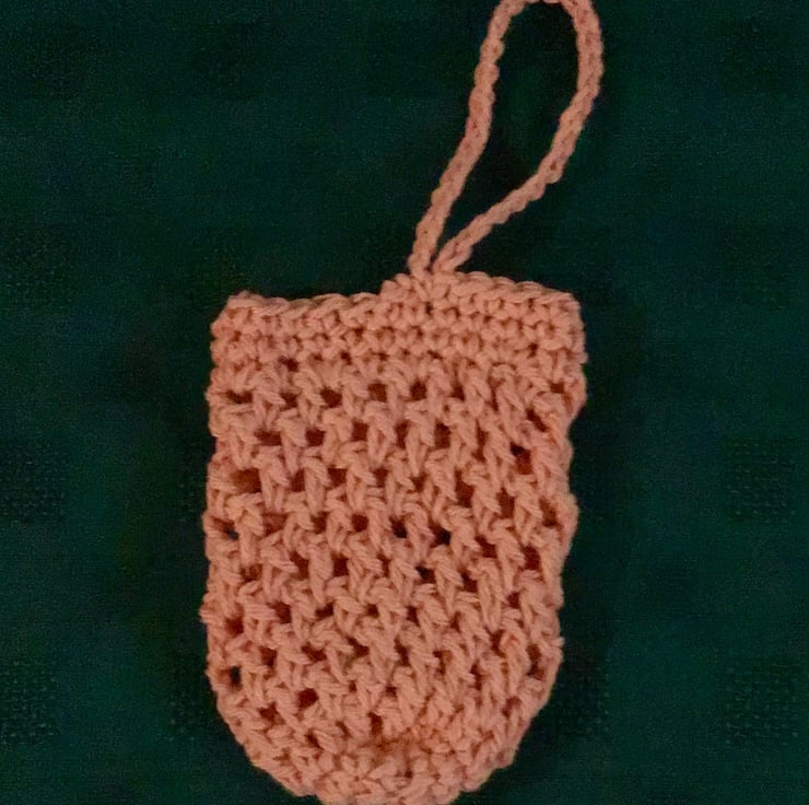 100% cotton soap sock. Hand crochet in Lancashire from apricot cotton. Brilliant for using in the bath or shower. Put your soap bar inside and use as a scrub instead of a flannel. No need for shower gel. Hang up to dry afterwards.