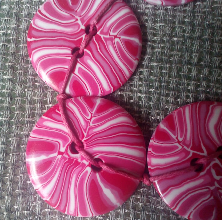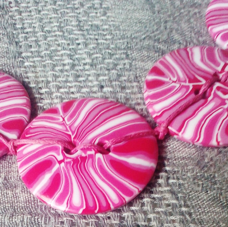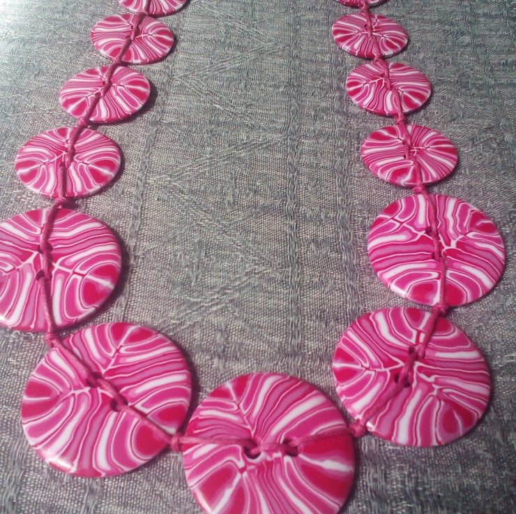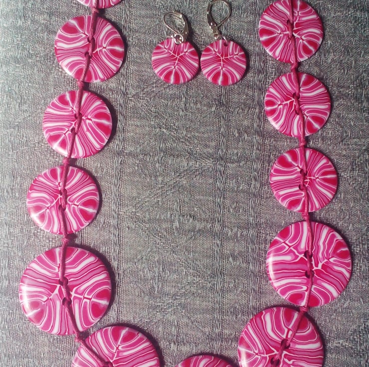 Button Necklace and Earring set. Buttons are hand made by me from Polymer Fimo clay. Buttons are 3.4 cm and 2.8, earrings 2.0 cm diameters. I used waxed cotton cord to string buttons. Findings are silver plated (nickel and lead free).