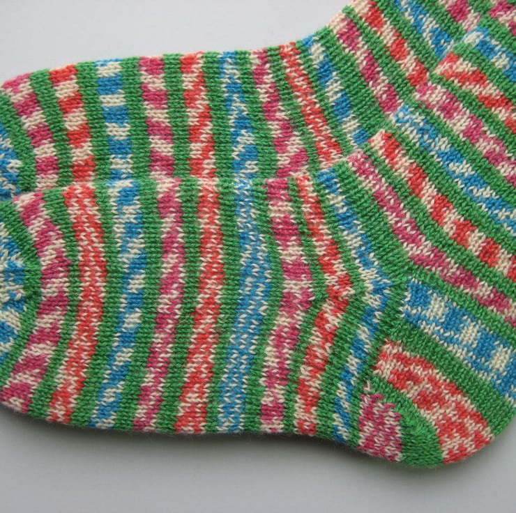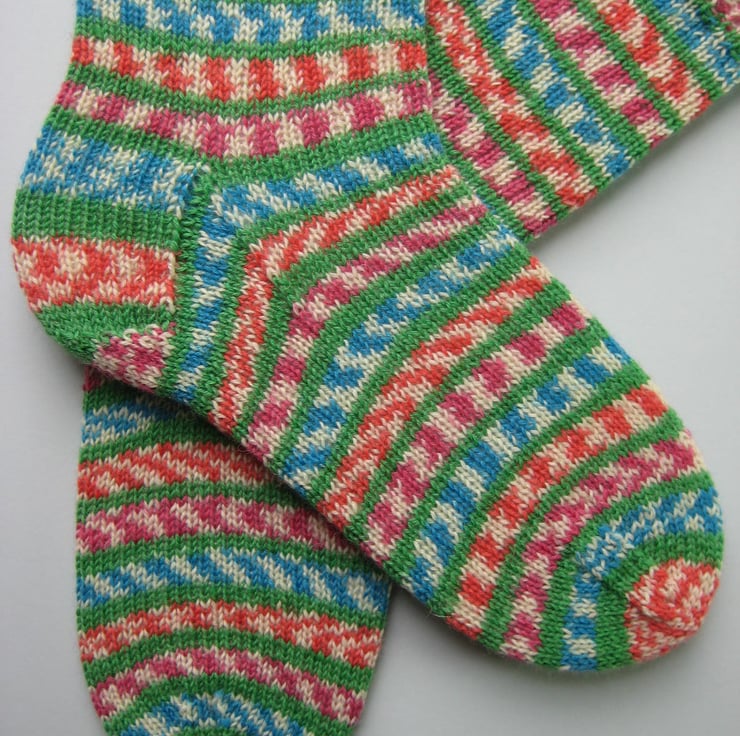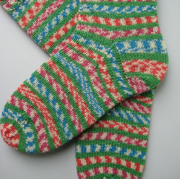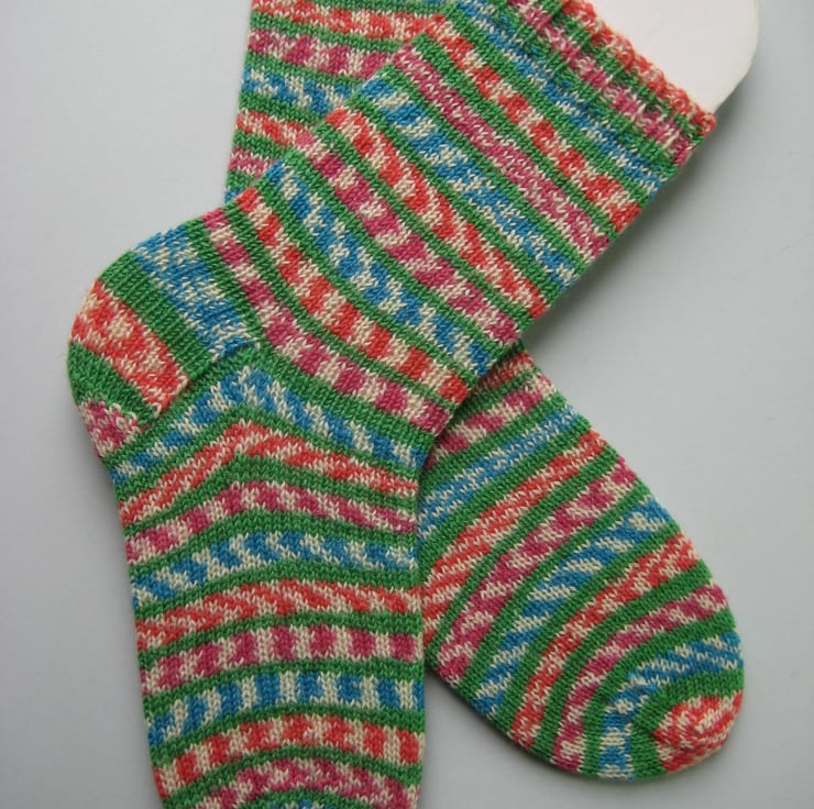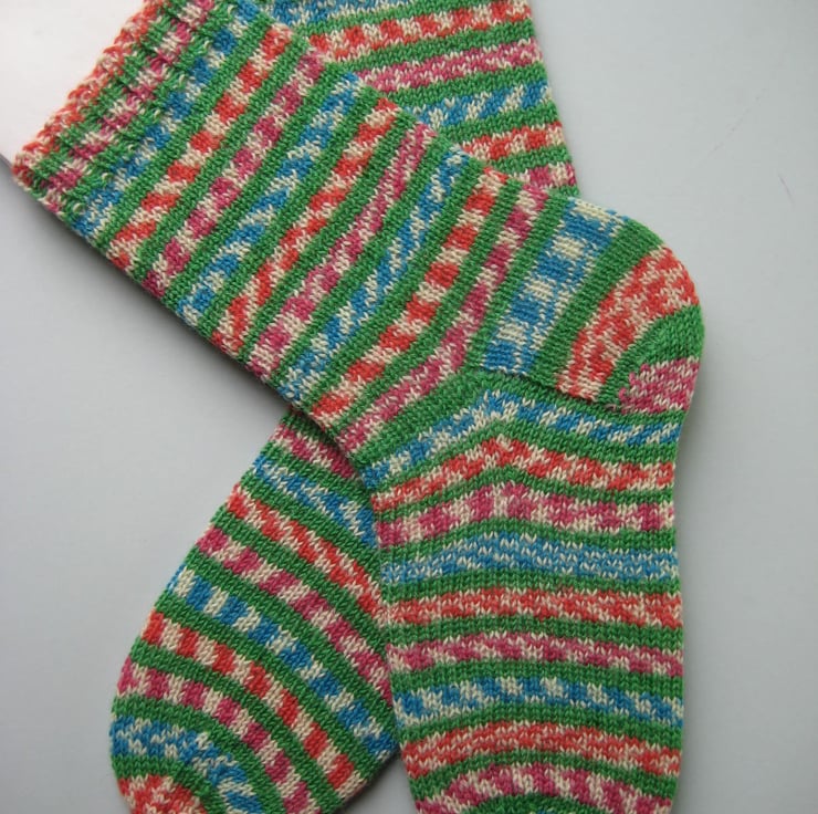 Hand knitted wool socks made from West Yorkshire Spinners 'fairy lights' 4 ply self patterning sock yarn, 75% wool 25% polyamide, in shades of blue, green, pink, red and cream.