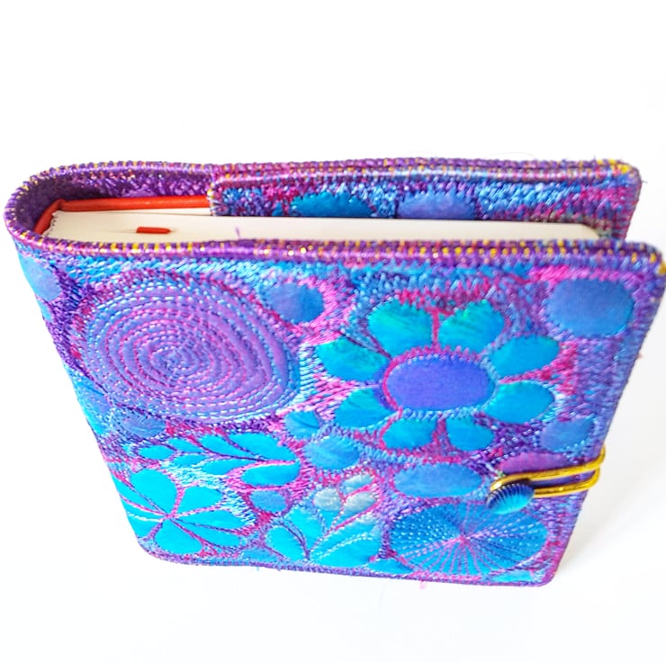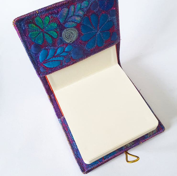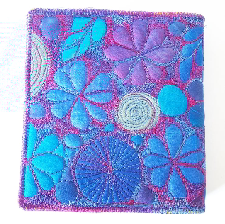 This is a handmade machine stitched fabric textile notebook cover and cream plain paper artists sketchbook 12cms x 12cms. The cover is removeable and yoy can replace the sketchbook inside.