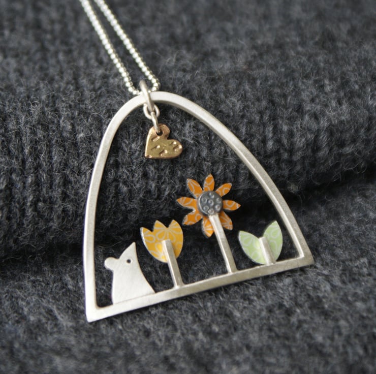 A quirky necklace featuring a little mouse, with a line of flowers and a little brass heart, hand crafted from sterling silver and aluminium.