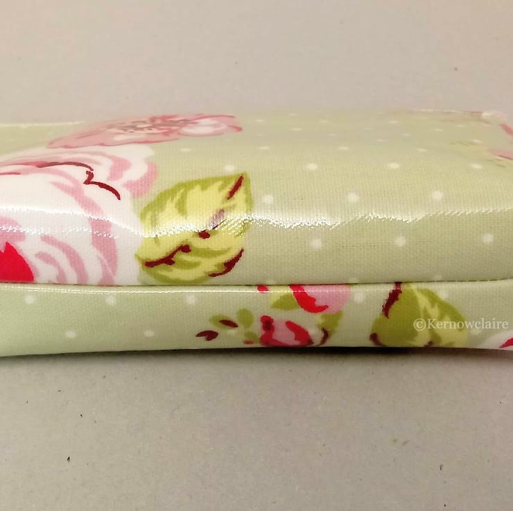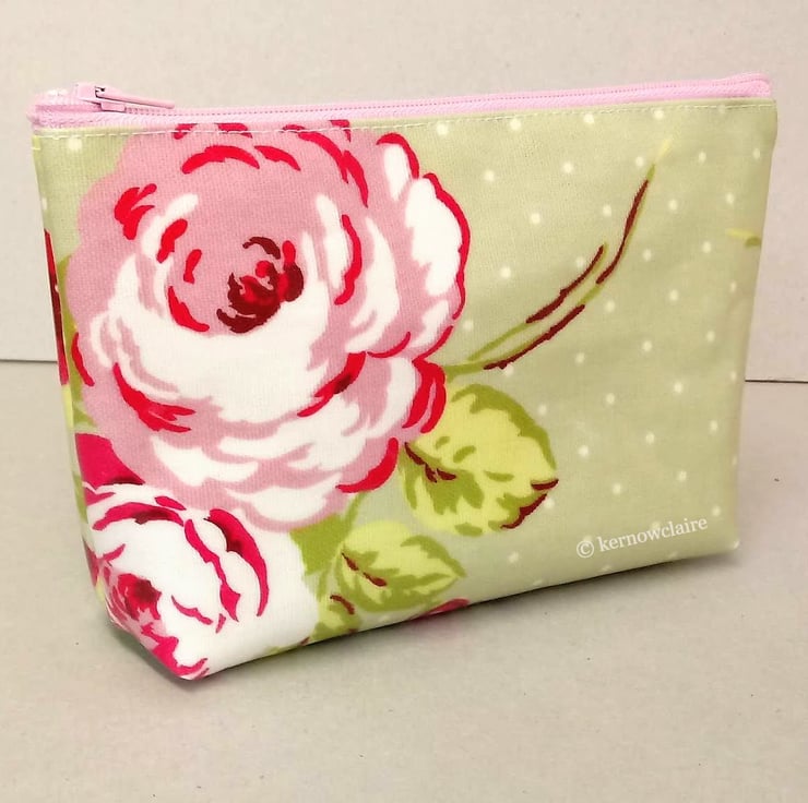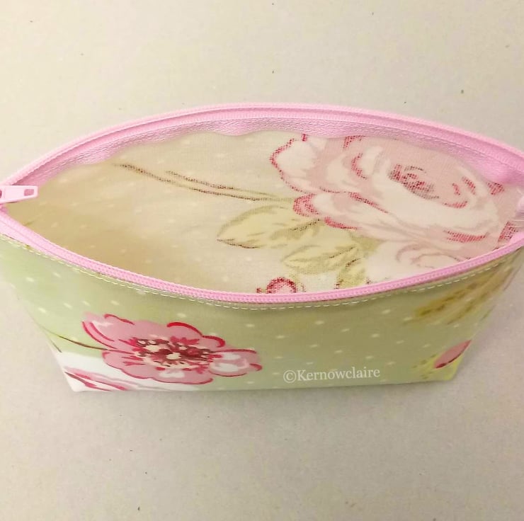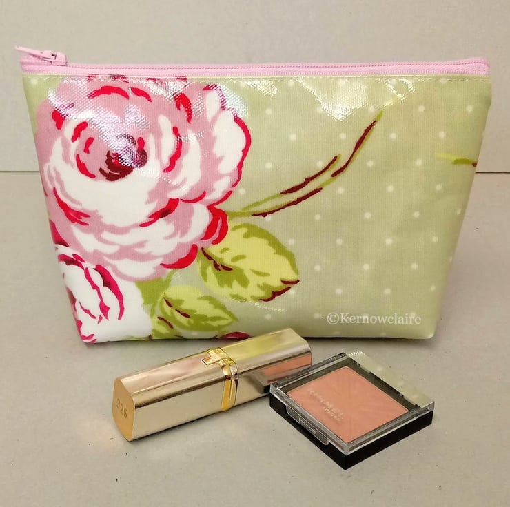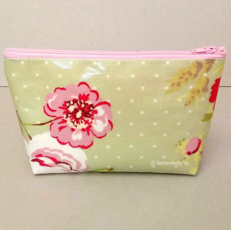 This is a lovely make up bag, handmade in a pale green oilcloth with pink flowers. It has a pink zip and flat bottom with strong inner seams. Perfect for cosmetic items and lots of other uses. This bag can be wiped clean or hand washed. It is not lined as made in a thick quality, sturdy oilcloth.