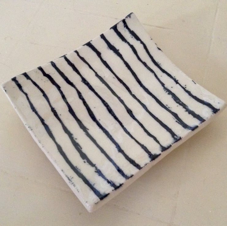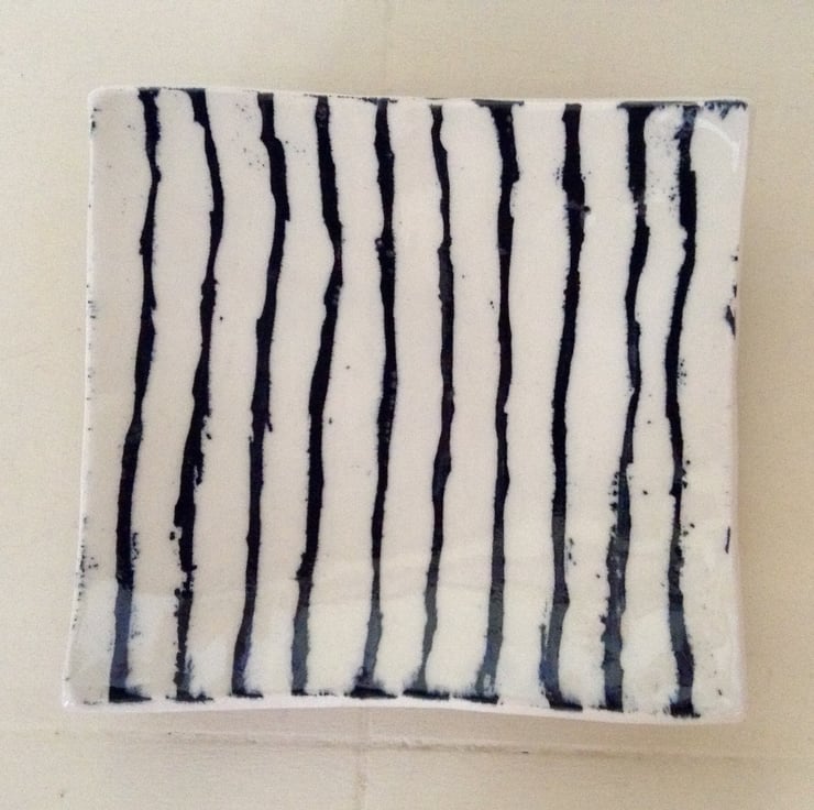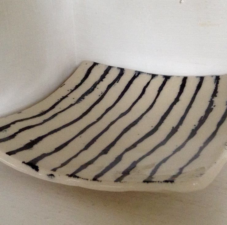 Rectangular cream stoneware plate with beautifully simple black abstract decoration. It has a glossy transparent glaze.The plate measures 23 cms x 17.5 cms and has three little stud feet to keep it stable . It's great for biscuits, little cakes and fruit or simply as a display piece. It is microwave and dishwasher safe.