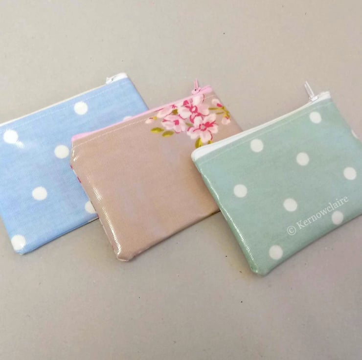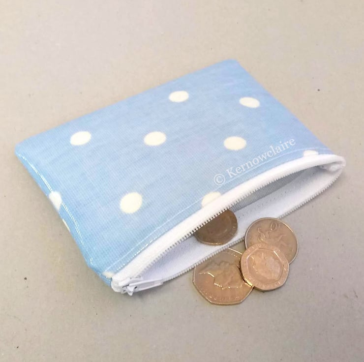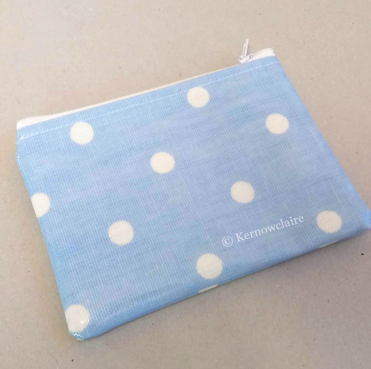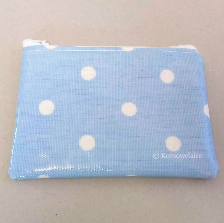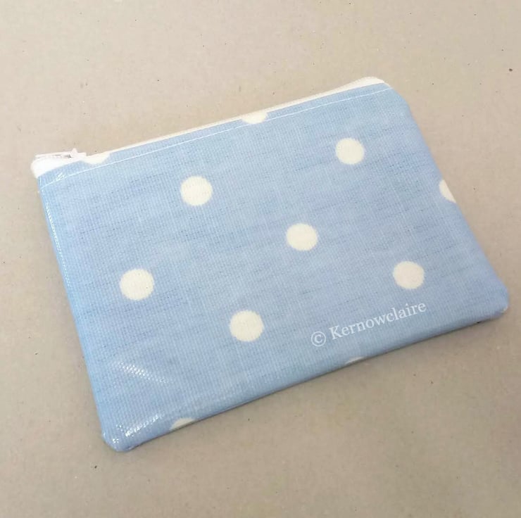 This is a lovely coin purse, handmade in a pale blue oilcloth with white spots. It has a white zip and strong inner seams which have been double stitched for added strength. It will fit coins, cards or both and an ideal size to carry in a pocket or handbag. It measures approx - 13 cm x 9.5 cm (5 inches x 3 3/4 inches) and can be wiped clean or hand washed. It is not lined as made from a thick quality oilcloth.