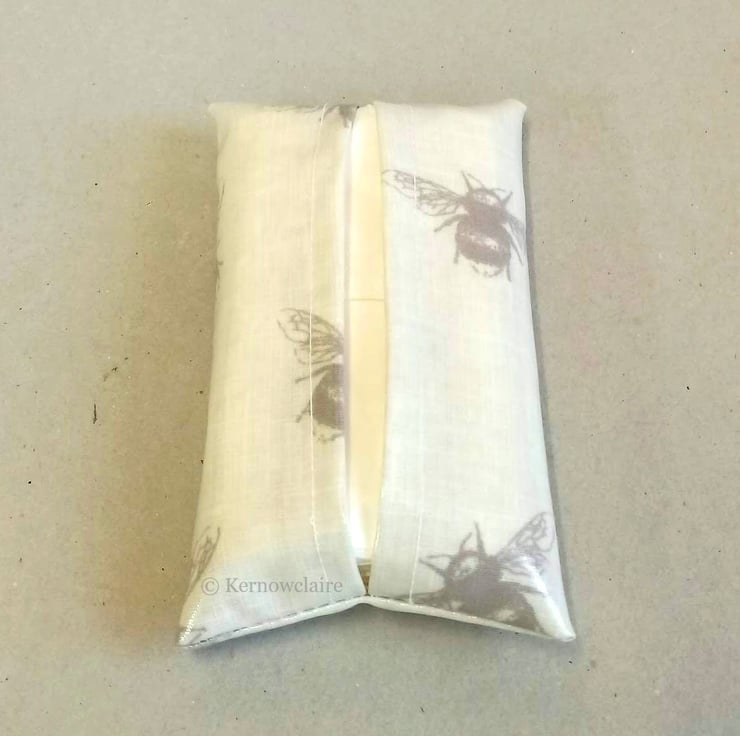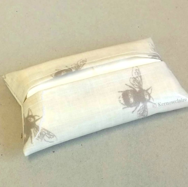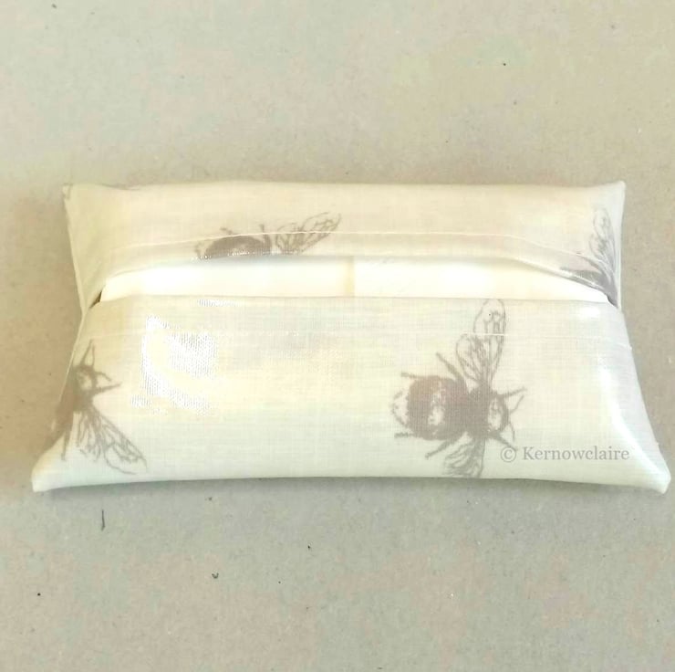 This is a lovely pocket tissue holder, handmade in a beige oilcloth with a bee pattern. Tissues are included and can be refilled when empty. The inner seams have been double stitched for added strength. A perfect size to carry in a pocket or handbag.