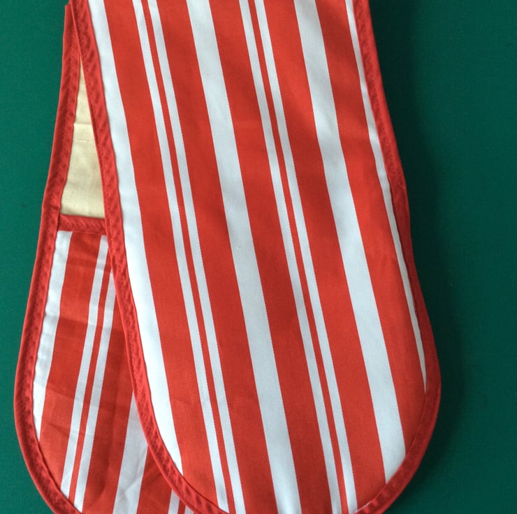 The red and white striped design makes this practical and appealing for male or female cooks .