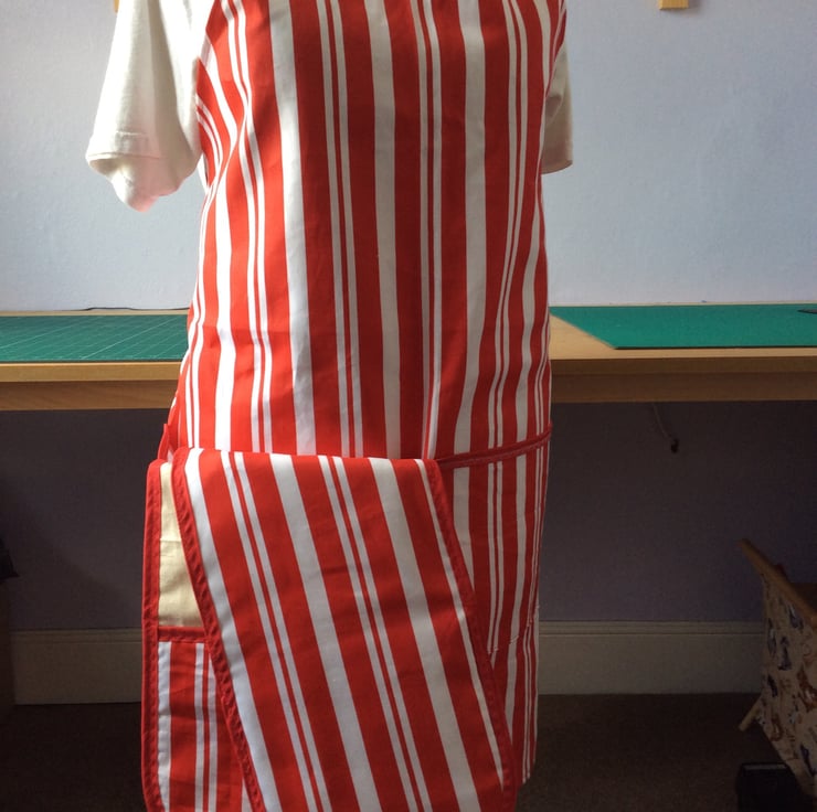 Apron is a generous wrap around style with large handy pocket. Ideal for the bar-b-que season.