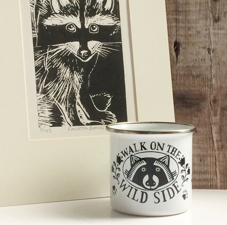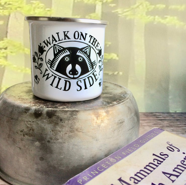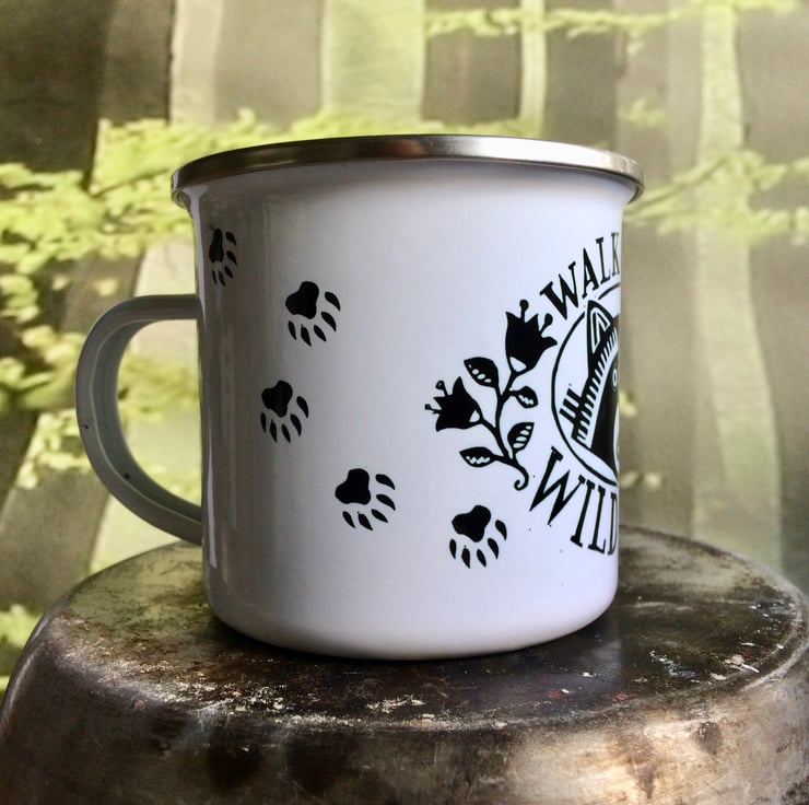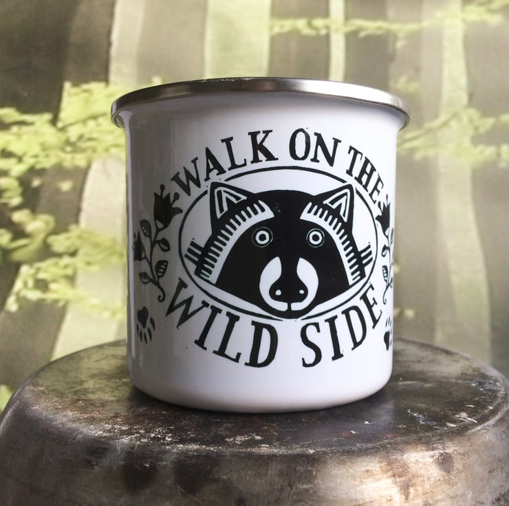 An enamel mug perfect for your next camping trip. Printed with my Lino print design Walk On The Wild Side, you're sure to spot some interesting wildlife goings on whilst sipping a morning brew out of this! Sent carefully packaged in first class post and ready to be taken on your next adventure.