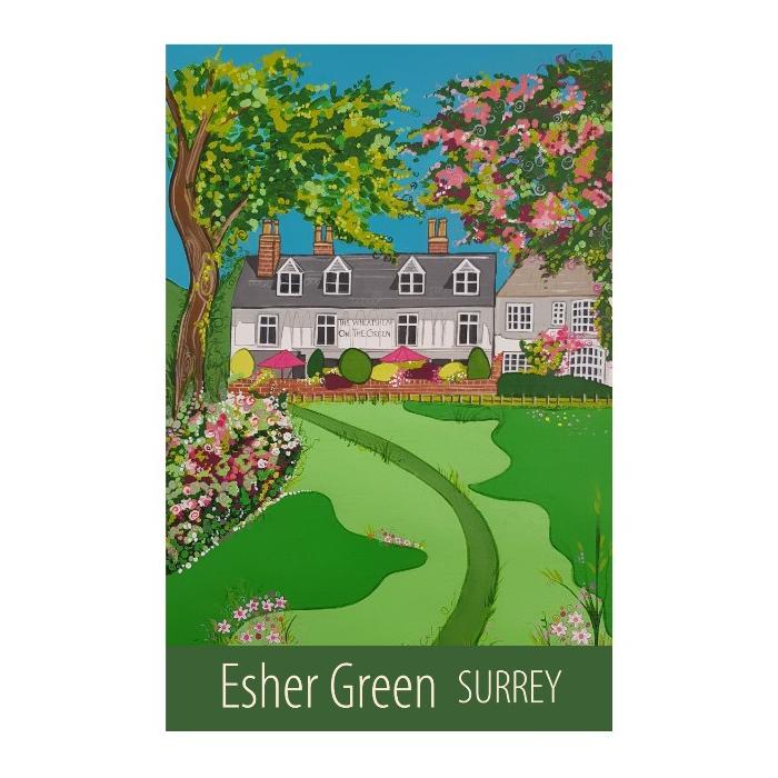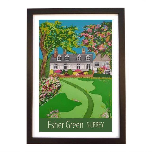 A beautiful A3 print of the view across Esher Green, in Surrey, towards the Wheatsheaf pub, in a contemporary black frame.