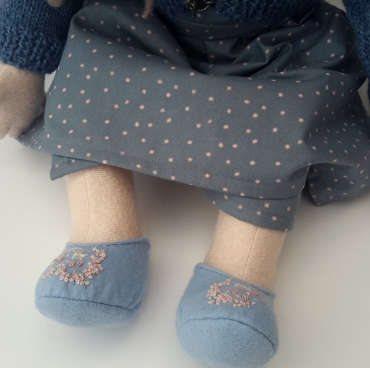 She wears white pants and blue wool felt Mary Jane style shoes with hand embroidery to the fronts.