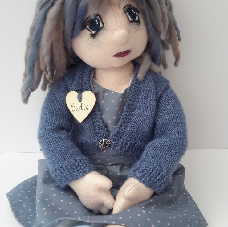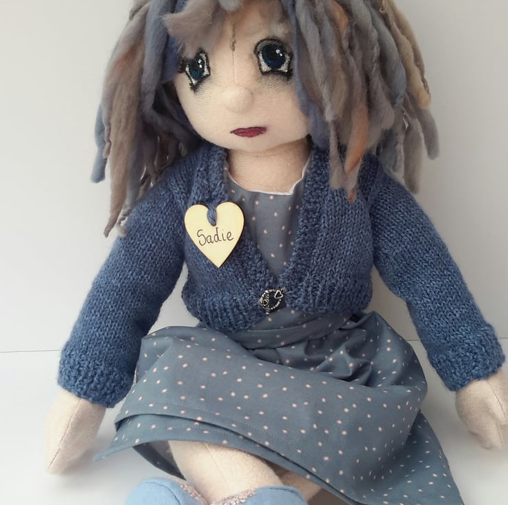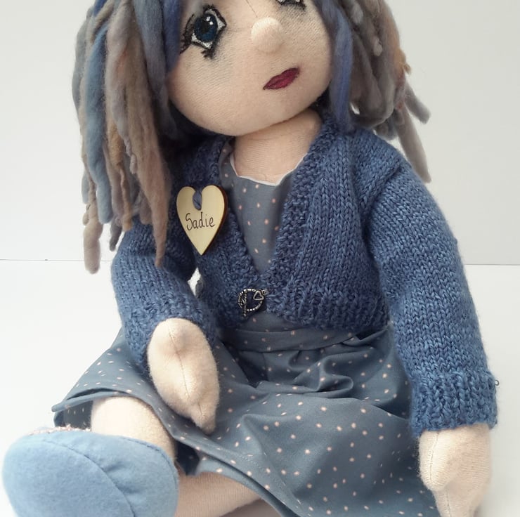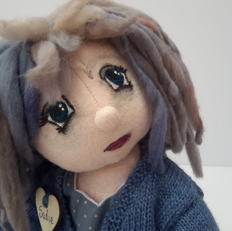 Sadie has gorgeous hand dyed and hand spun chunky, thick and thin merino wool in blues for her hair, her face has been hand painted using acrylics.