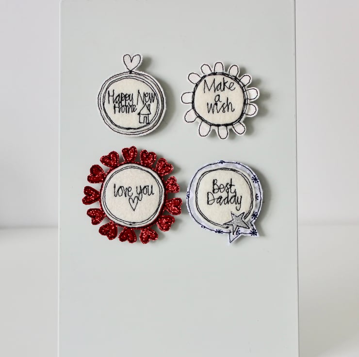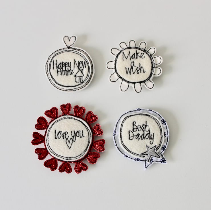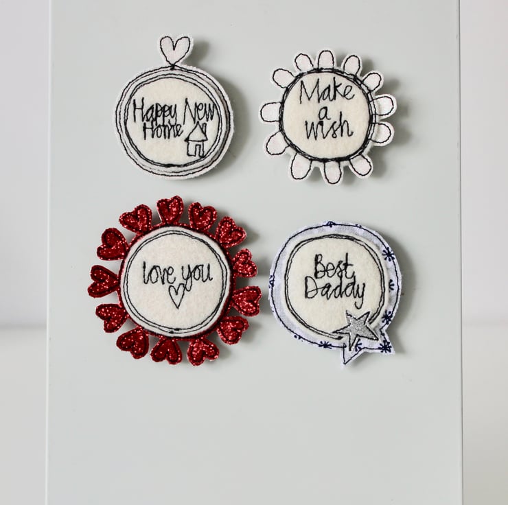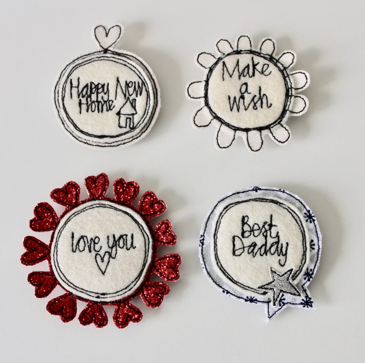 Each magnet is created using multiple layers of cloth, sewn using freehand machine embroidery and then cut out by hand. The magnet on the back is attached with hot glue.