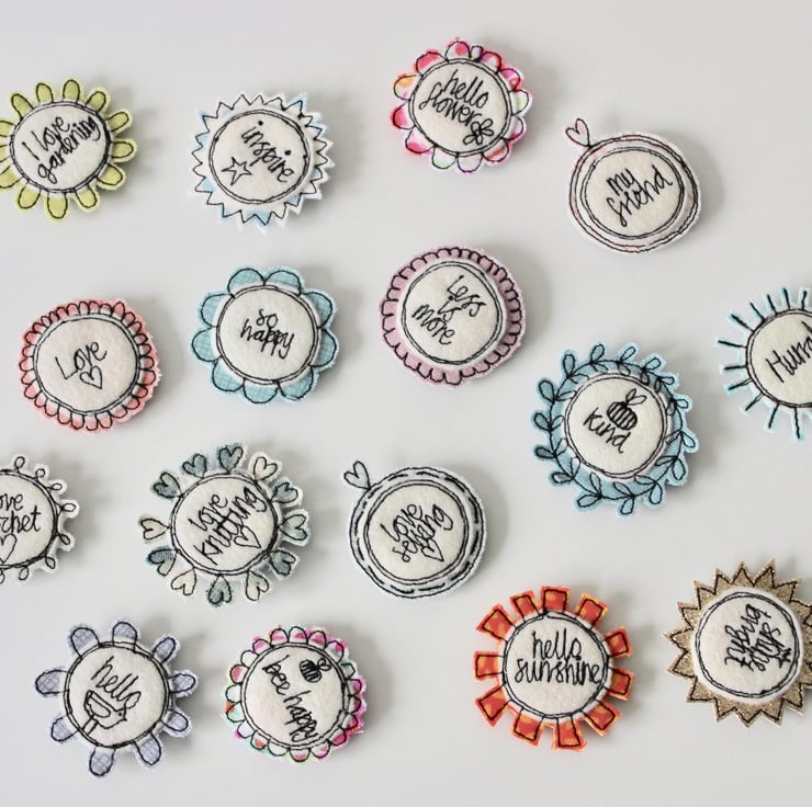 Each magnet is created using multiple layers of cloth, sewn using freehand machine embroidery and then cut out by hand. The magnet on the back is attached with hot glue.
