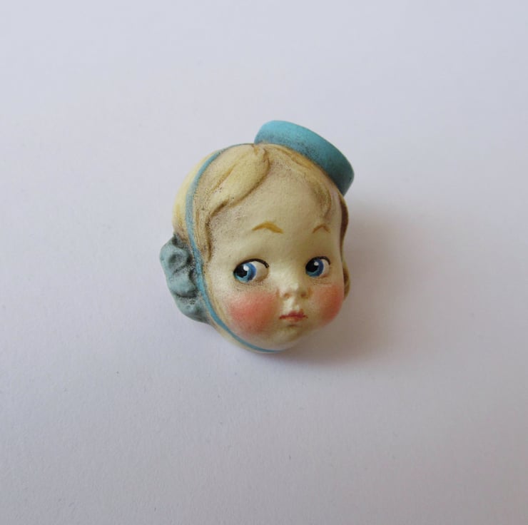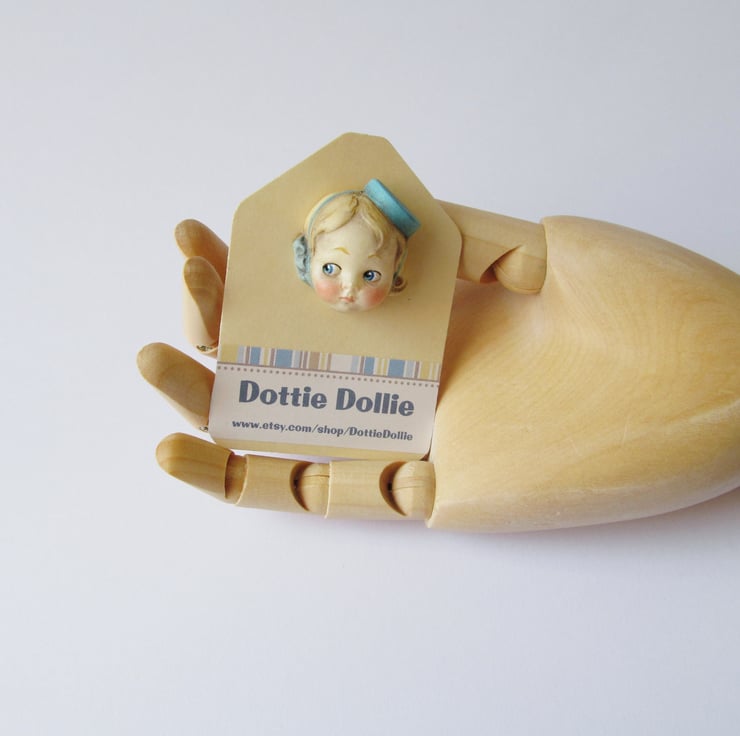 Dottie Dollie Doll Face Brooch - Bell Girl Judy is a handmade replica of a real broken antique doll head from my collection. The original head is dirty and unloved, having been discarded and buried as rubbish almost a hundred years ago.