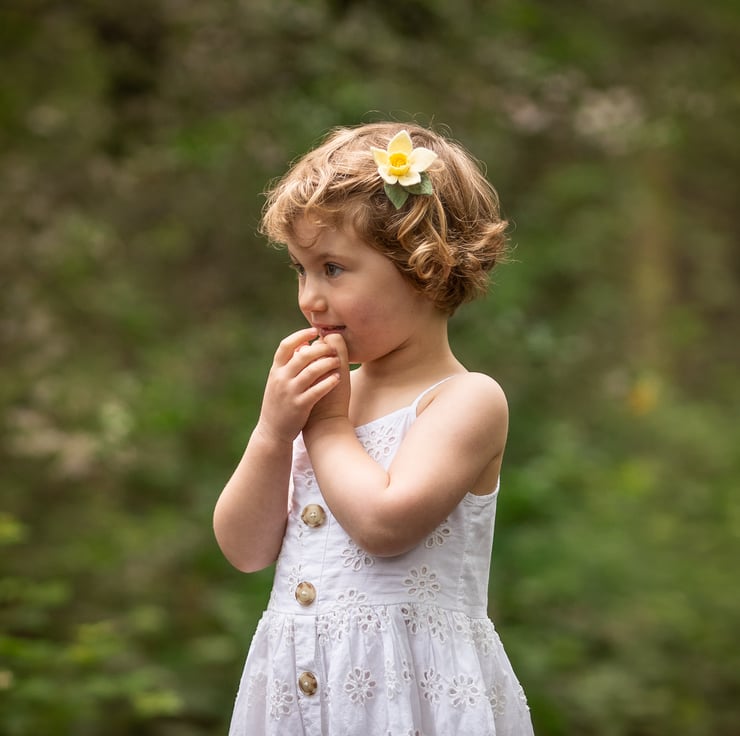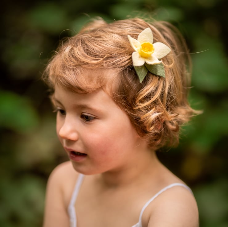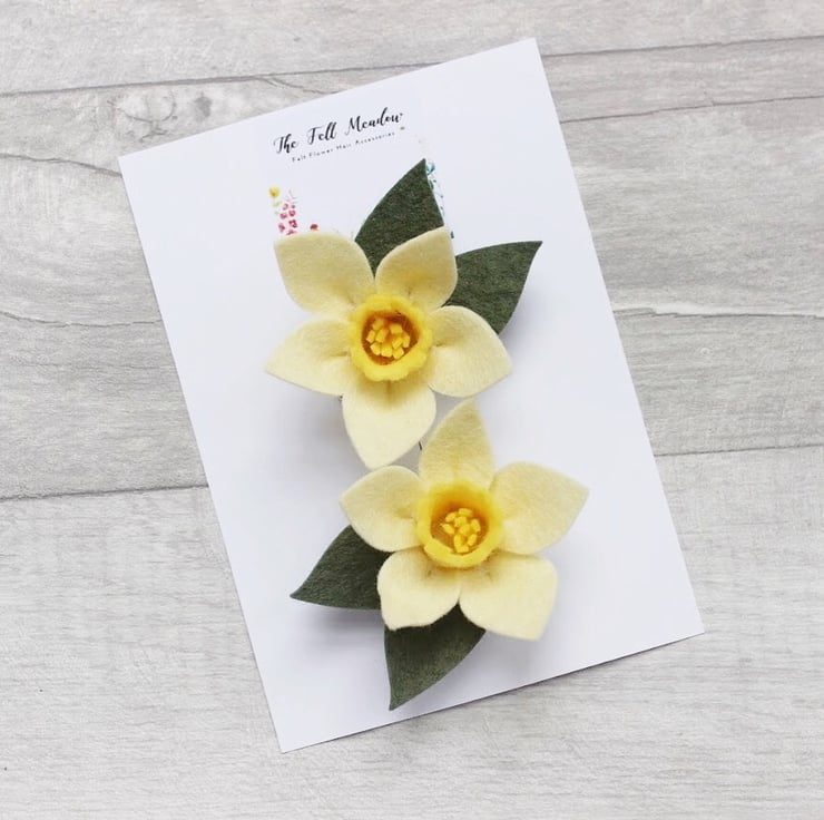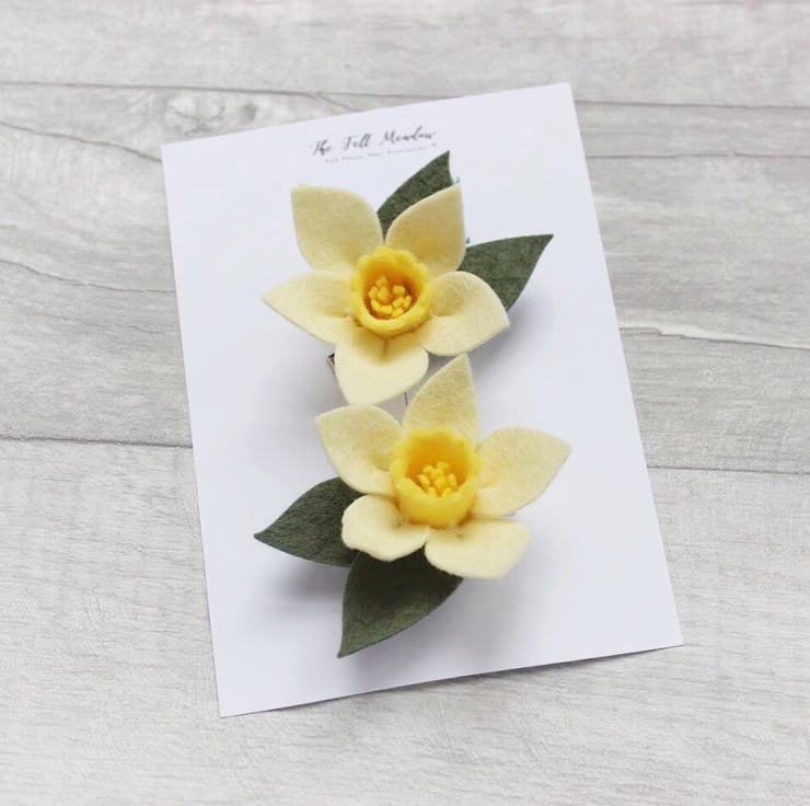A gorgeous set of felt daffodil hair clips. Each daffodil has been handcrafted using the finest wool felt and attached to 4.5cm alligator hair clips.. Ideal little girl gift set! Perfect for little pigtails or to keep toddler's flyaway curls in place.