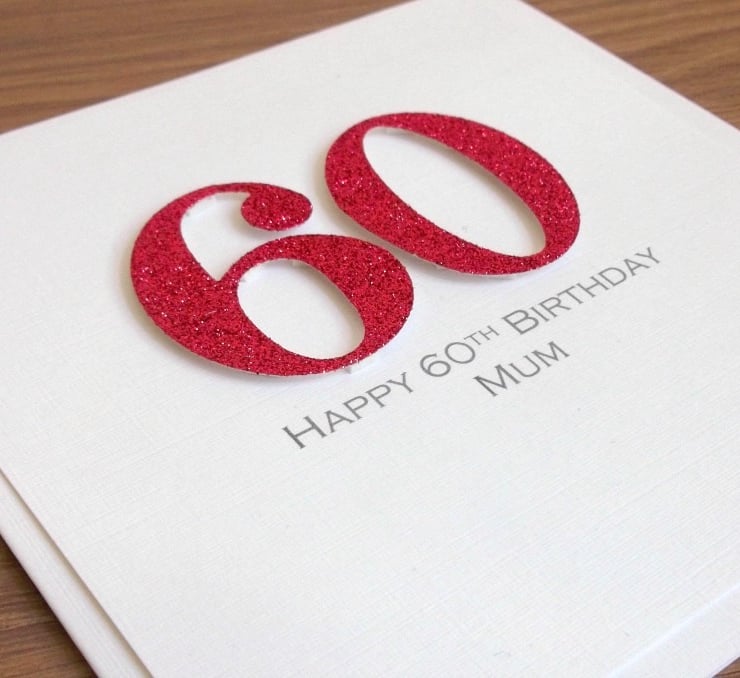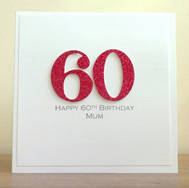 Featuring the number "60" die-cut from glitter card, with a personalised printed message.