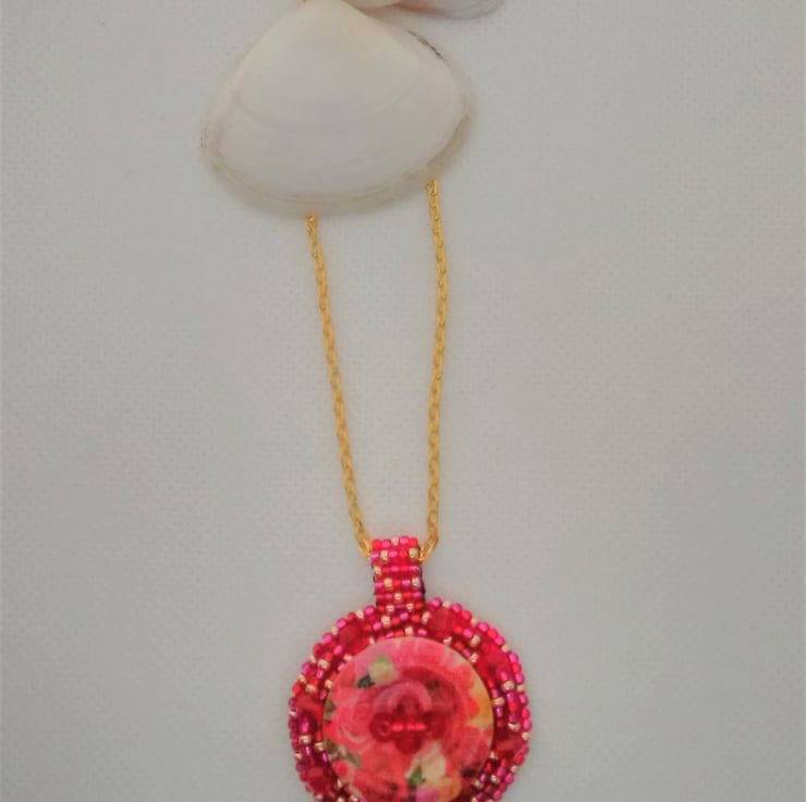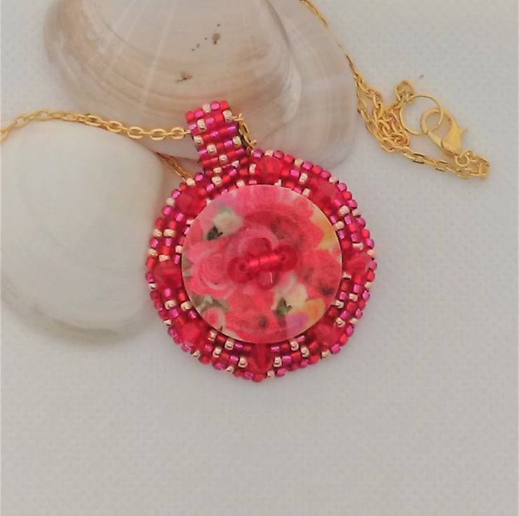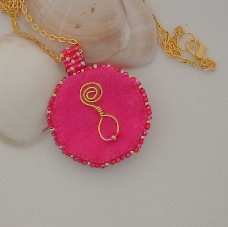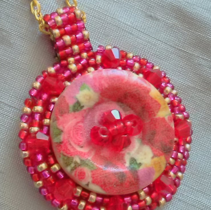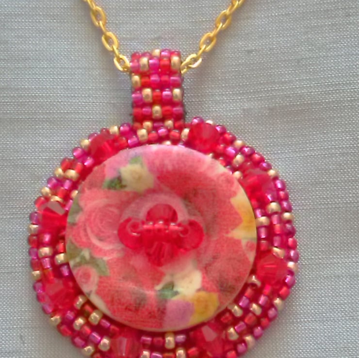 A very feminine design - a central floral wooden button is surrounded by red crystal bicones and bead embroidered seed beads in a mixture of red, fuschia and gold. The centre of the button is decorated with red crystal bicones and red seed beads. It features a ladder stitched beaded bail and a simple gold plated chain with lobster clasp. The pendant is backed with fuschia Ultrasuede and features my own design of spiral symbol, symbolising the bringing together of Reiki (Universal Life Force Energy) with my jewellery designs.