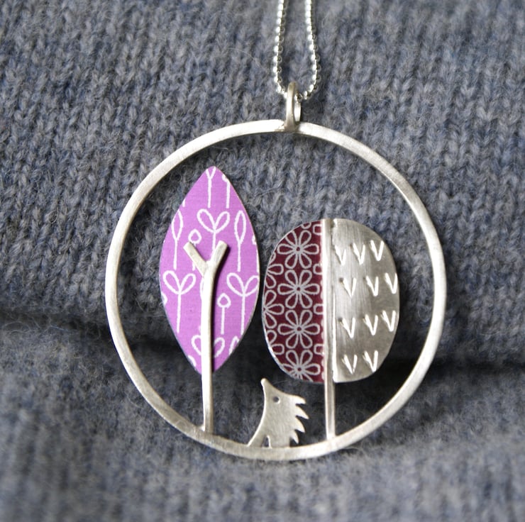 A cute necklace featuring 2 stylised trees and a little hedgehog hand crafted from sterling silver and aluminium. The framework is made from sterling silver square wire and silver sheet which has been textured with a little 'v' shapes. The coloured pieces are anodised aluminium which are blind riveted to the silver. The pendant is hung in an 18 inch sterling silver chain.