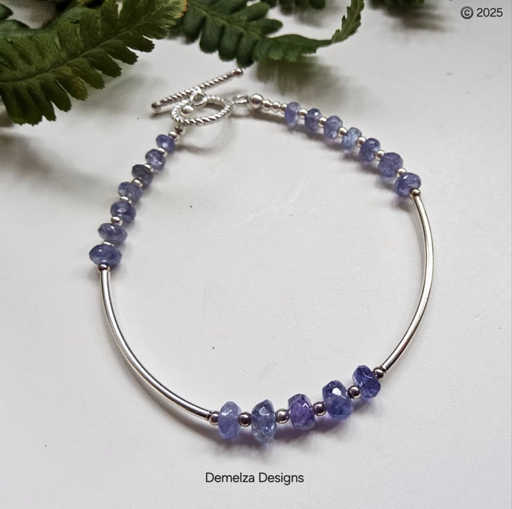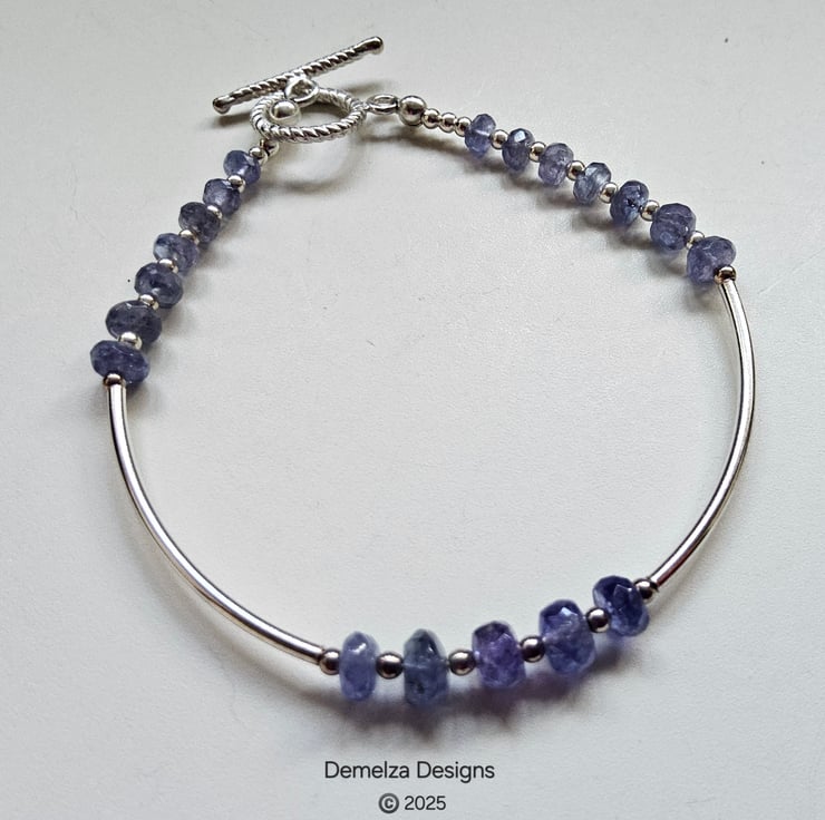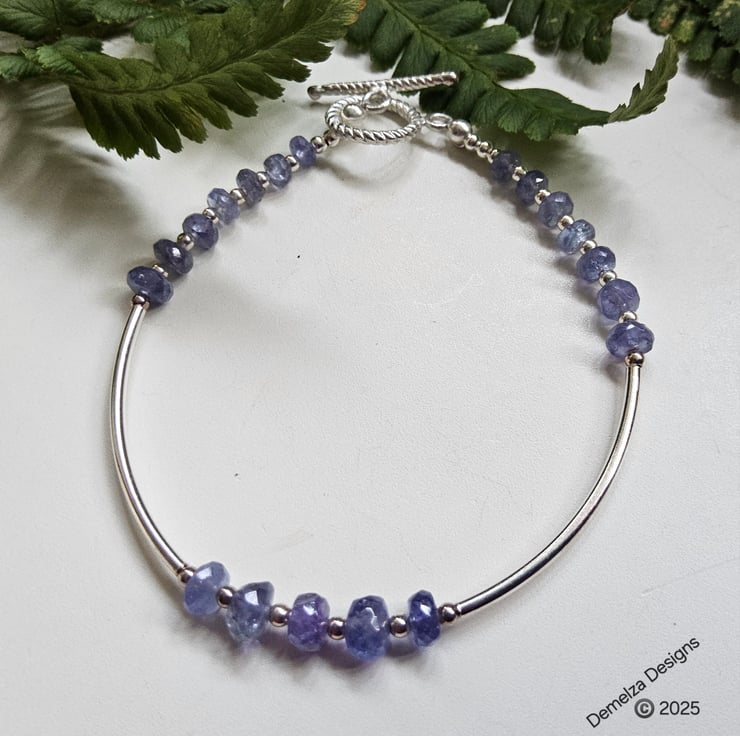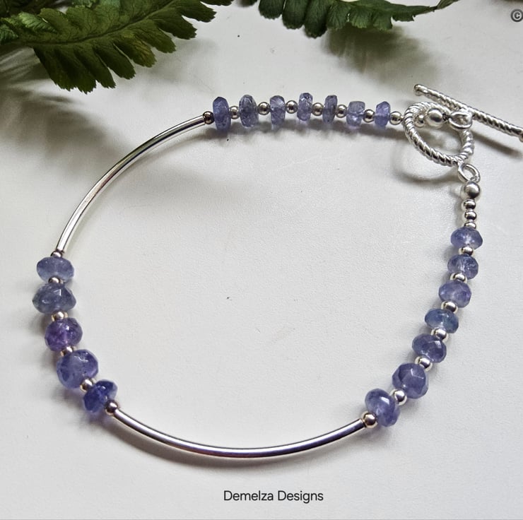 A beautiful bangle style bracelet designed and hand crafted in Cornwall by Demelza Designs using AAA bead grade tanzanite rondelle cut tanzanit gemstones.