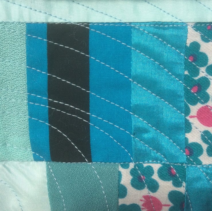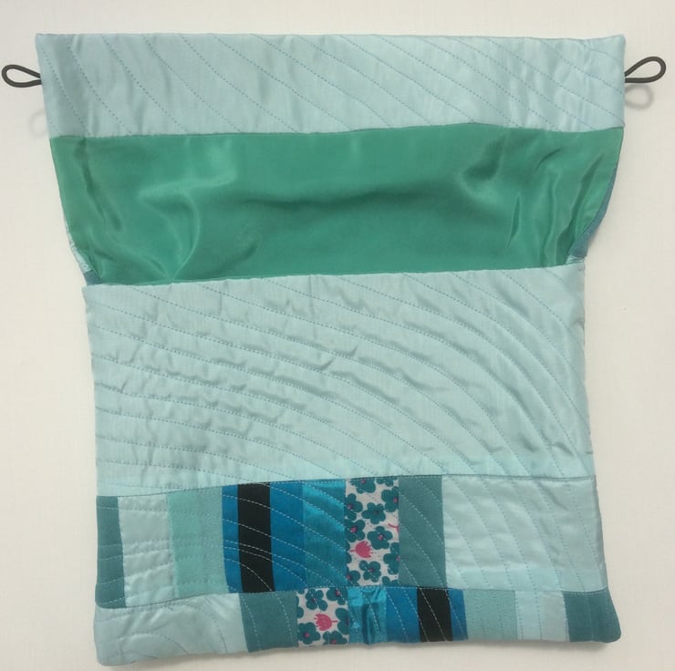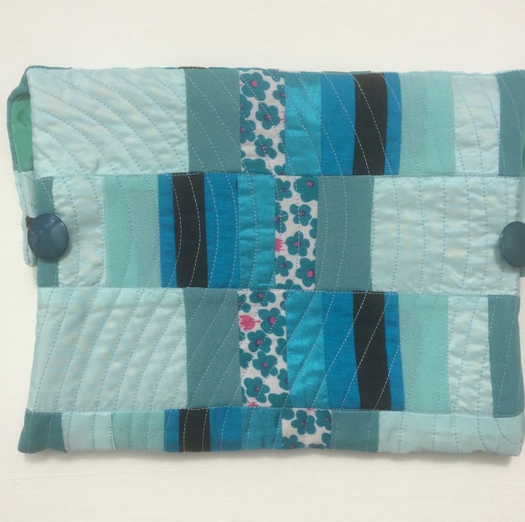 One of a kind, freestyle patchwork, quilted envelope clutch. I have used a mixture of fabrics, some recycled, in shades of turquoise with a touch of black and pink to make this unique handbag. It has a fastening of two buttons on the back of the bag and black elastic button loops on the side of the flap. The bag is lightly padded and quilted with a decorative, curving wave pattern. It has a green silky lining with an inner slip pocket. The bag measures approximately 24cm x 18cm.