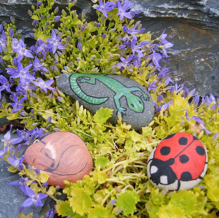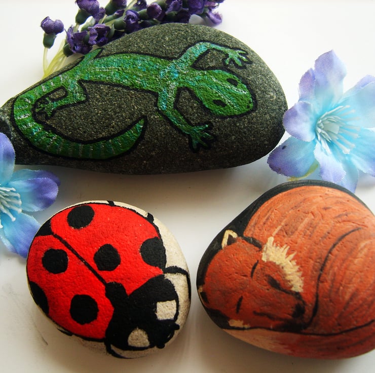Add a colourful touch of design to either your interior or exterior, with this set of three hand-painted decorative animal cobble stones.