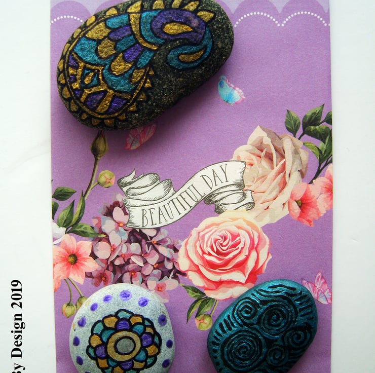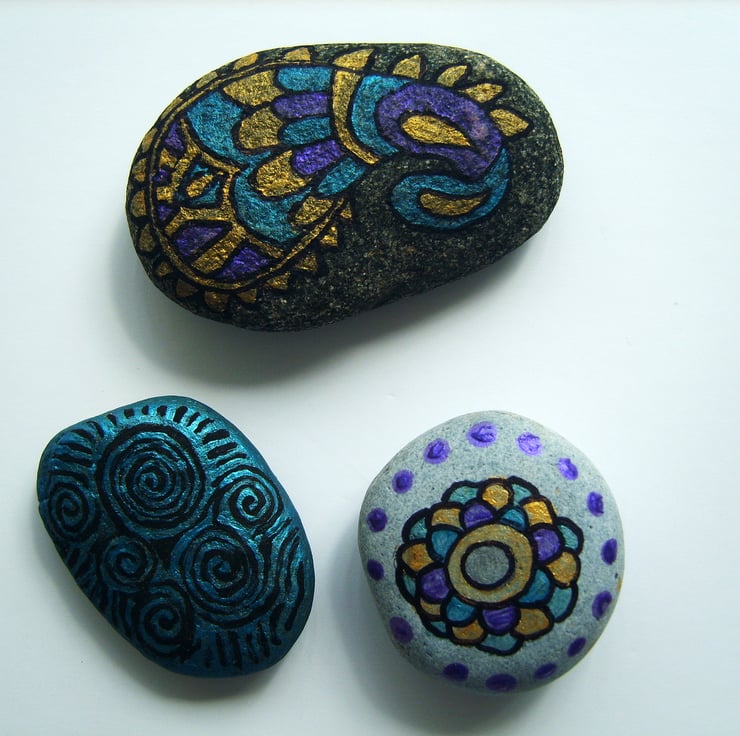 Add some colour to your home or garden with this trio of hand-painted mandala inspired stones set.