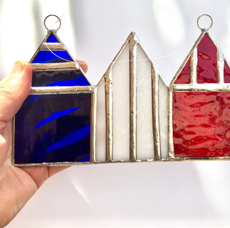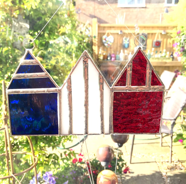 I decided I’d make some larger beach huts so here is one. This strip of beach huts has been made from 3 huts which have been made from blue, whit and red stained glass. Each piece of glass has been hand cut, ground and copper foiled before being soldered together. To rings and a length of fishing line has been attached for hanging purposes. I will include a window plunger with every suncatcher.