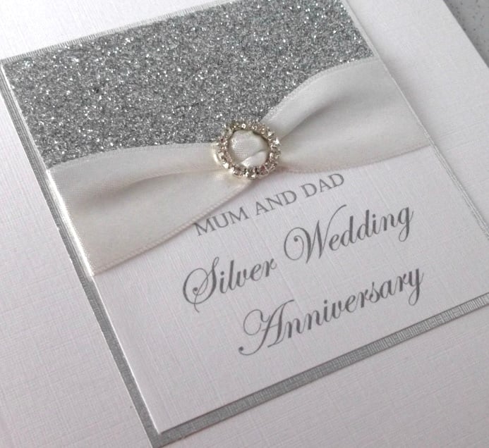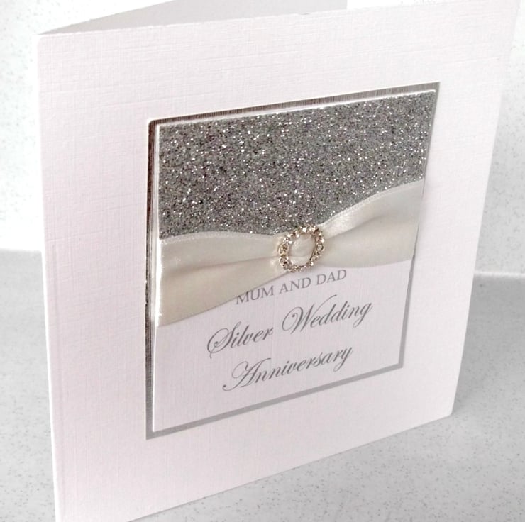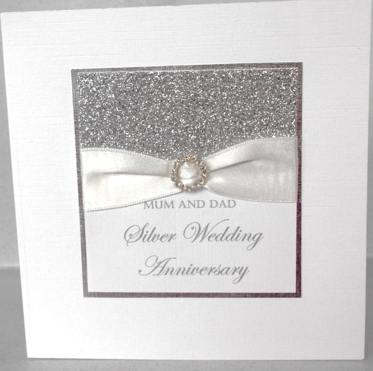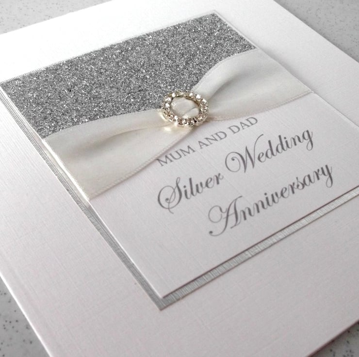 Handmade designer 25th anniversary card, with a clean and simple design. A high quality, white card base with a panel of silver glimmer paper, white ribbon and diamante buckle. You can personalise this card with any names and if needed, I can add a date too. This design can also be adapted for any special anniversary - just ask me!