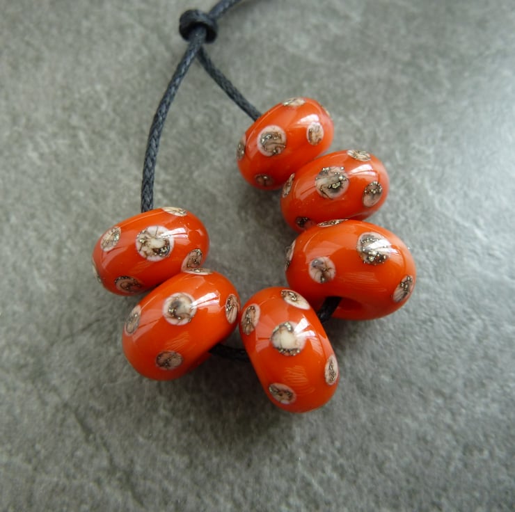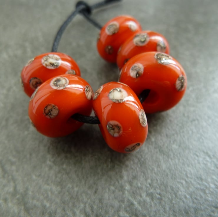 A set of 6 lampwork glass beads made with orange glass and featuring ivory spots.