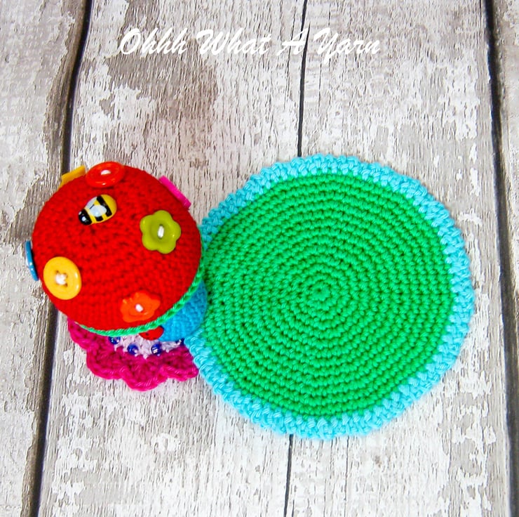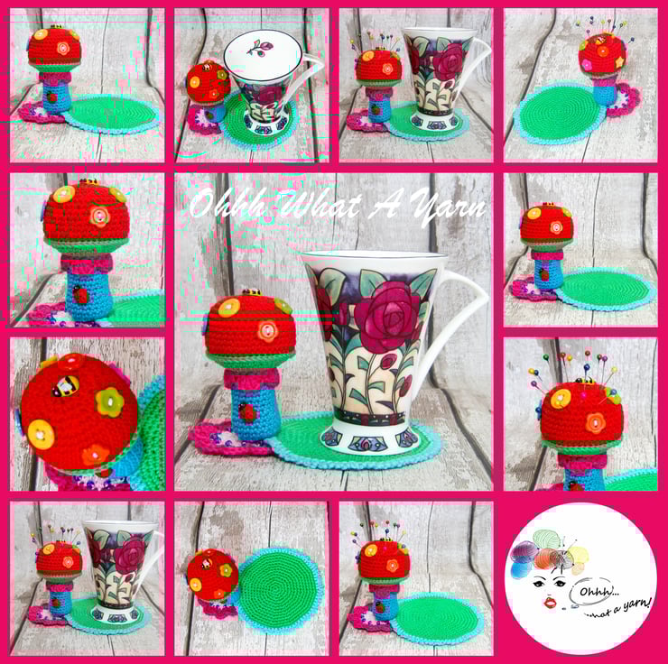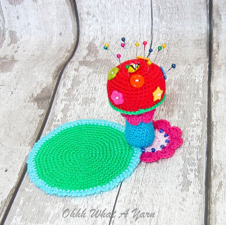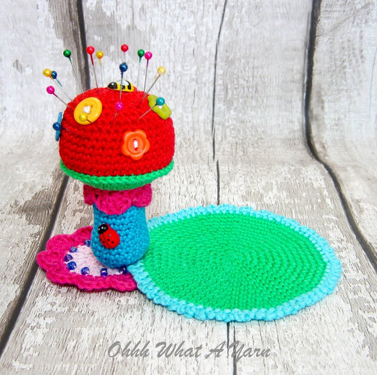 This bright and cheerful toadstool coaster/pin cushion has been crocheted using premium quality mercerised cotton which gives it a lovely sheen and stitch definition.
