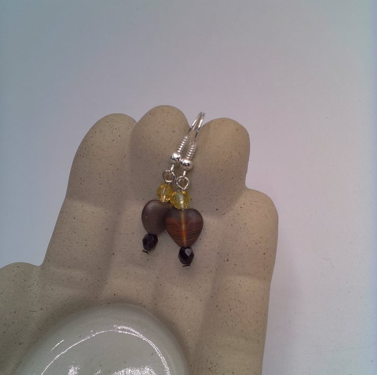 This beautiful jewellery set comprises a necklace, bracelet and pair of earrings. It is light and easy to wear all day or for an evening out. The necklace is made using 8 mm glass heart shaped beads in shades of umber with a pink and brown fleck with 4 mm glass crystal beads, and a pendant made with a single heart bead and and two golden brown crystals. The clasp is a silver plated toggle clasp. The earrings are made with one of the heart beads and two crystal bicone beads suspended on silver plated hook ear wires. The bracelet is stretchy and is threaded on jeweller's elastic. The necklace is 16 inches (40.5 cm) in length with a drop of 0.75 inches (2.25 cm) from the base of the silver plated bail, the earrings have a drop of 0.75 inches (2.25 cm) from the base of the ear wire. The jewellery set will be dispatched wrapped in tissue paper in an organza bag and delivered via Royal Mail first class post. This pretty set would make a lovely gift for an elegant lady.