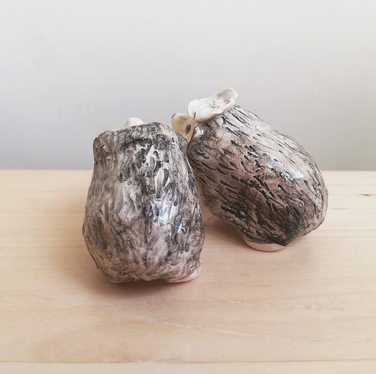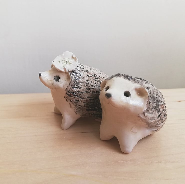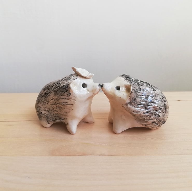 Each hedgehog was hand sculpted from white clay including the bride's flower. Once bisque fired they were hand painted then clear glazed before their second firing.