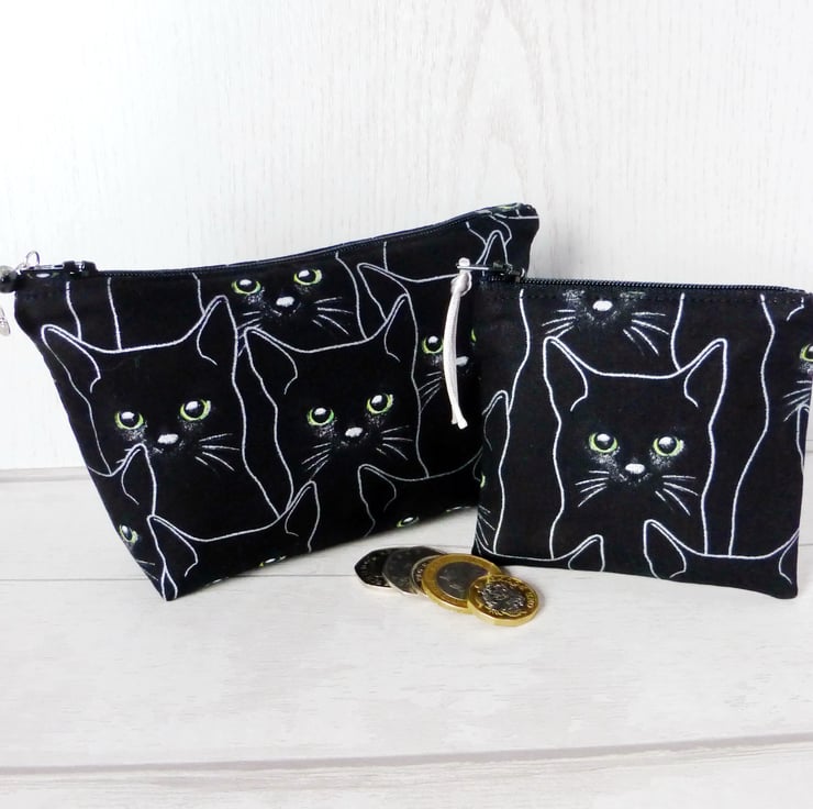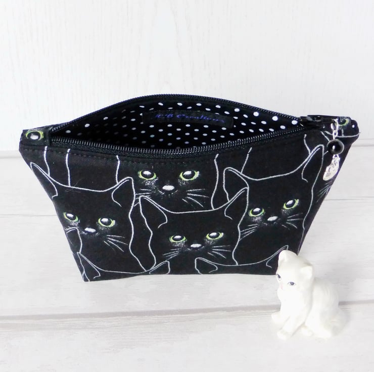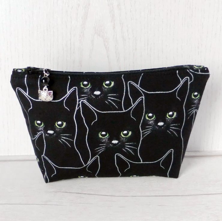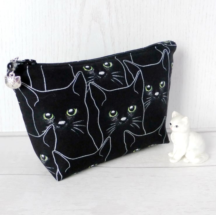 A medium sized make up bag/zipped pouch made from 100% cotton fabric.The main fabric is black with an all over print of black cats, outlined in metallic silver colour with green highlights for the eyes. .